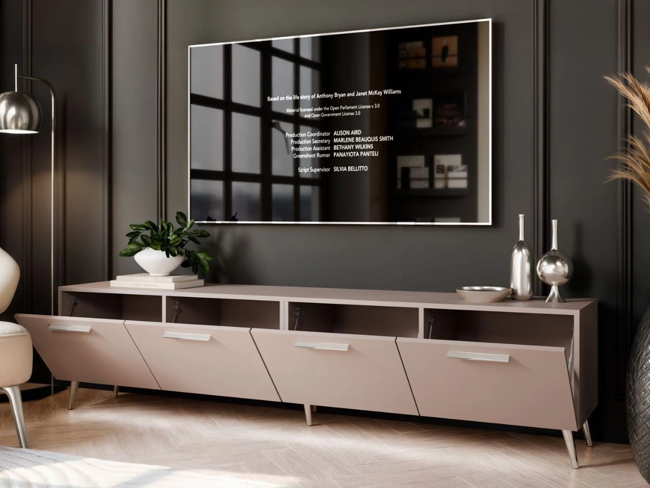 TV-Lowboard mit Türen und LED-Beleuchtung auf Silbernen Metallbeinen 200 cm Noaé Kaschmir