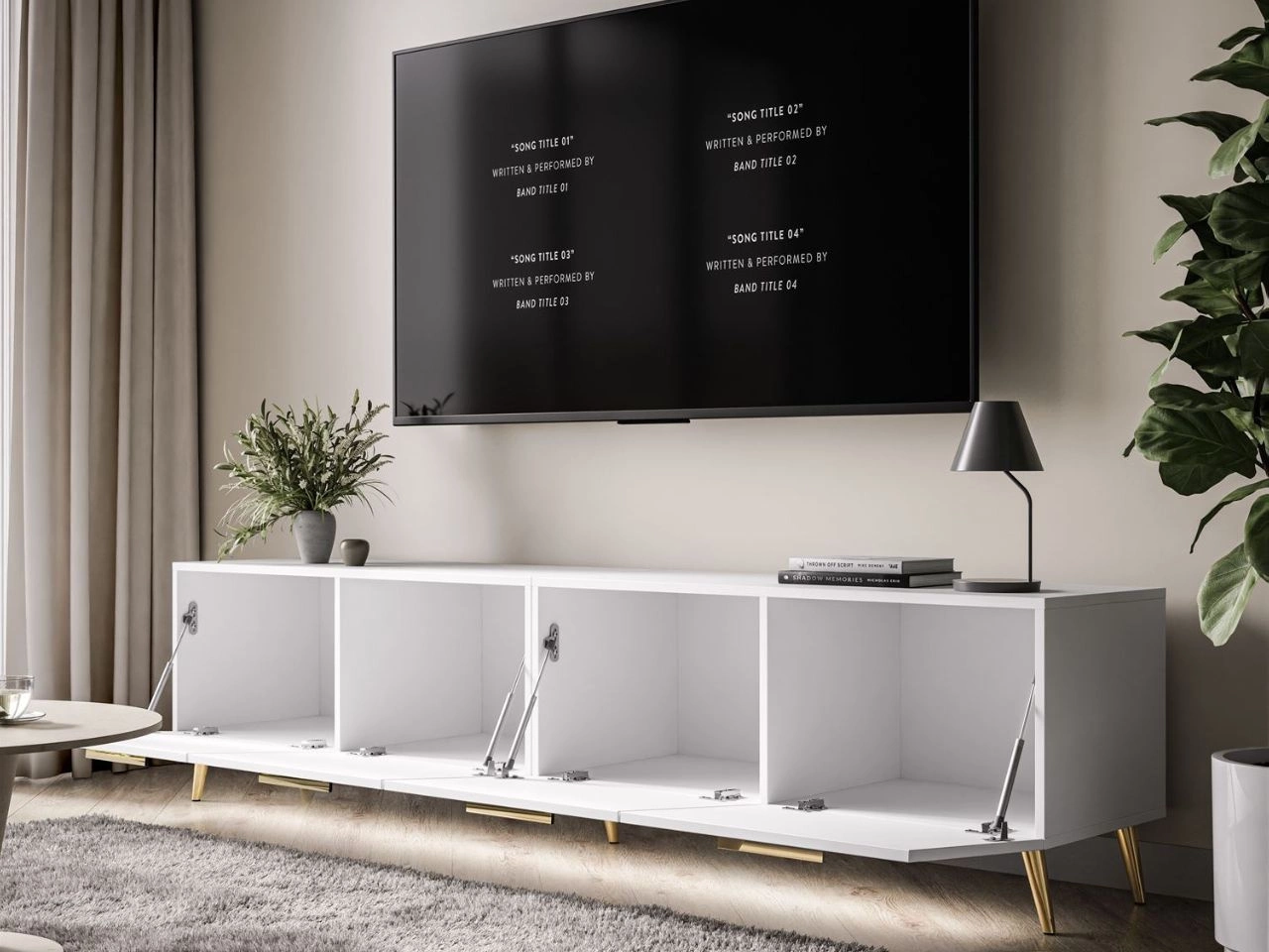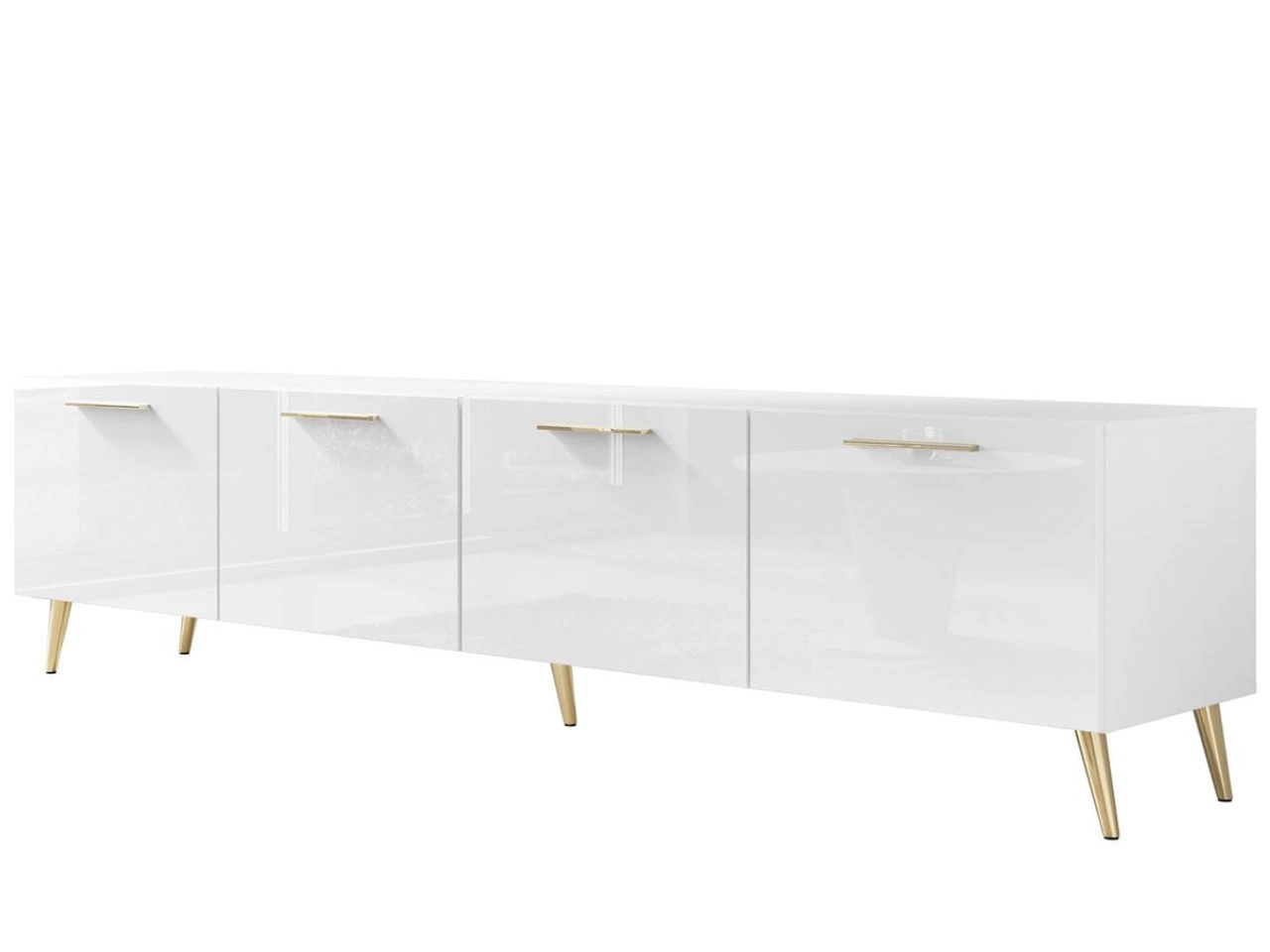 TV-Lowboard mit Türen und LED-Beleuchtung auf Goldenen Metallbeinen 200 cm Noaé Weiß Hochglanz