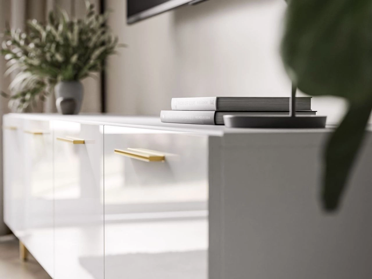 Front des TV-Lowboards ist aus mit Acryl beschichteter Platte gefertigt, die der Oberfläche einen eleganten Hochglanz verleiht und gleichzeitig kratzfest ist. Feine Griffe ermöglichen ein komfortables Öffnen der Fronten und bewahren zugleich den modernen Charakter des Möbels sowie seine glatte, minimalistische Form. Das gesamte Möbelstück steht auf hohen, schlanken und leicht schrägen Metallbeinen, die der Konstruktion visuelle Leichtigkeit verleihen, die Reinigung erleichtern und eine praktische Nutzung des Raumes unter dem Möbel ermöglichen.