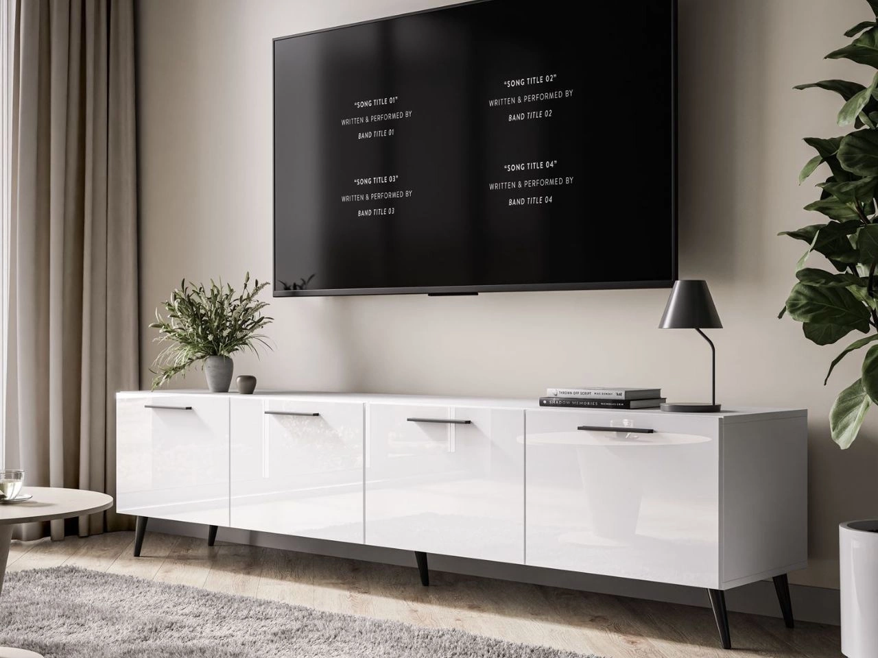 Front des TV-Lowboards ist aus mit Acryl beschichteter Platte gefertigt, die der Oberfläche einen eleganten Hochglanz verleiht und gleichzeitig kratzfest ist. Feine Griffe ermöglichen ein komfortables Öffnen der Fronten und bewahren zugleich den modernen Charakter des Möbels sowie seine glatte, minimalistische Form. Das gesamte Möbelstück steht auf hohen, schlanken und leicht schrägen Metallbeinen, die der Konstruktion visuelle Leichtigkeit verleihen, die Reinigung erleichtern und eine praktische Nutzung des Raumes unter dem Möbel ermöglichen.