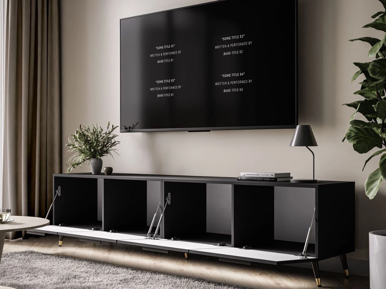Front des TV-Lowboards ist aus mit Acryl beschichteter Platte gefertigt, die der Oberfläche einen eleganten Hochglanz verleiht und gleichzeitig kratzfest ist. Feine Griffe ermöglichen ein komfortables Öffnen der Fronten und bewahren zugleich den modernen Charakter des Möbels sowie seine glatte, minimalistische Form. Das gesamte Möbelstück steht auf hohen, schlanken und leicht schrägen Metallbeinen, die der Konstruktion visuelle Leichtigkeit verleihen, die Reinigung erleichtern und eine praktische Nutzung des Raumes unter dem Möbel ermöglichen.