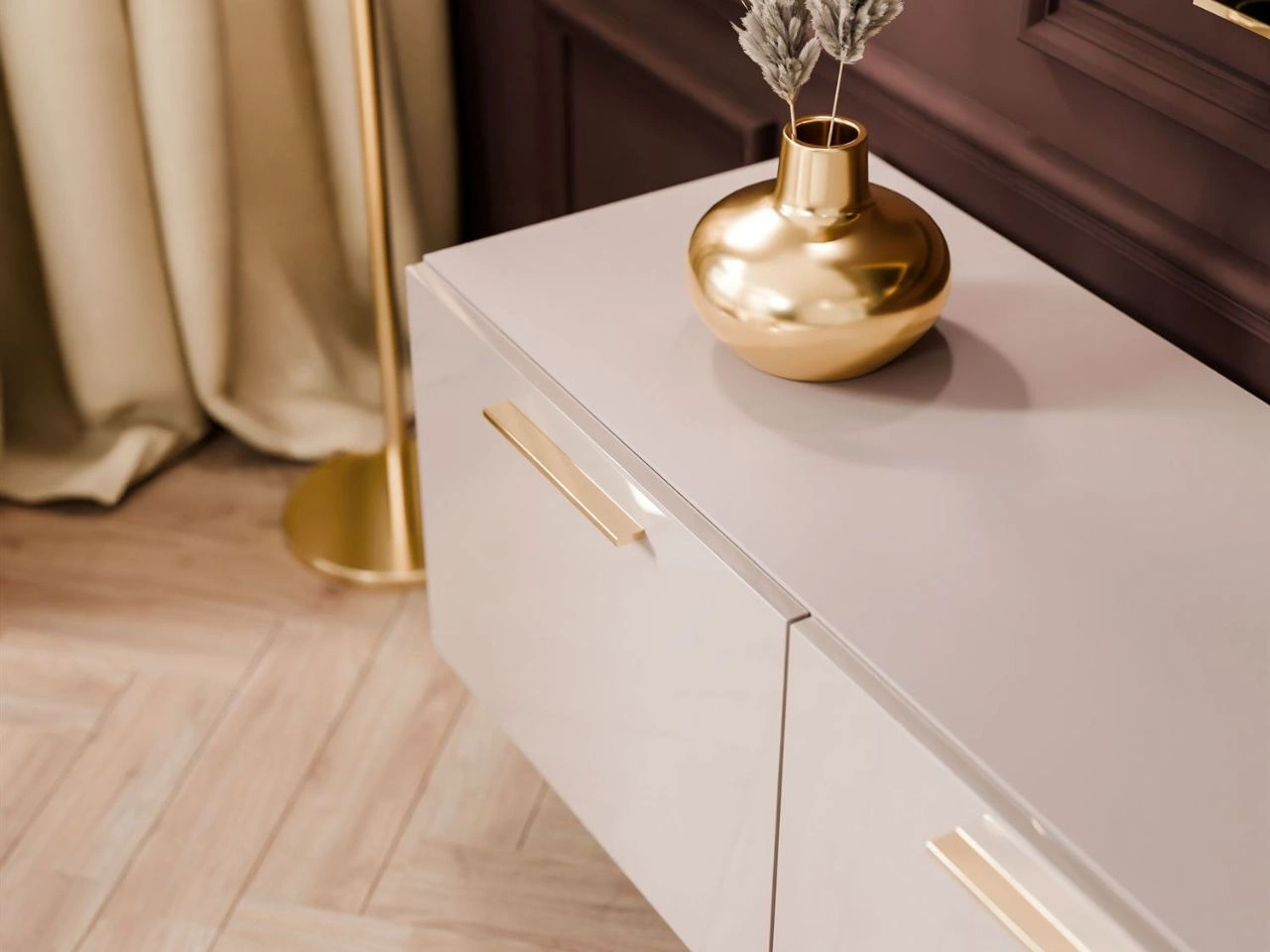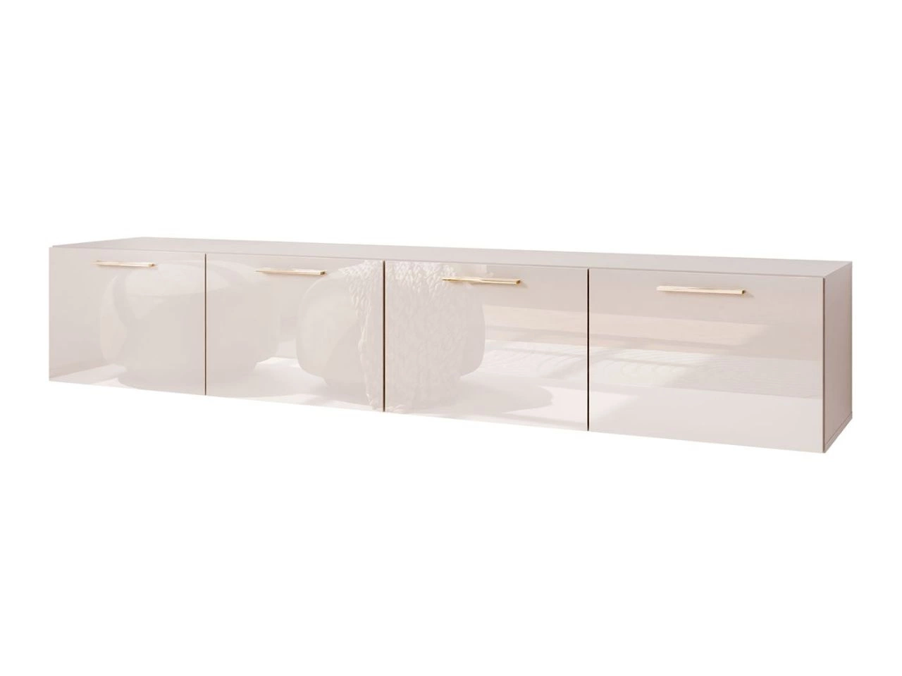 Front des TV-Lowboard besteht aus einer mit Acryl beschichteten Platte, die der Oberfläche eleganten Hochglanz verleiht und ihre Kratzfestigkeit erhöht. Feine Griffe sorgen für ein komfortables Öffnen der Fronten und betonen zugleich den modernen Stil des Möbels sowie seine schlichte, minimalistische Linie. Modell ist als Hängeschrank konzipiert, wodurch der Raum effizient genutzt wird und das Interieur an Leichtigkeit und modernem Charakter gewinnt.