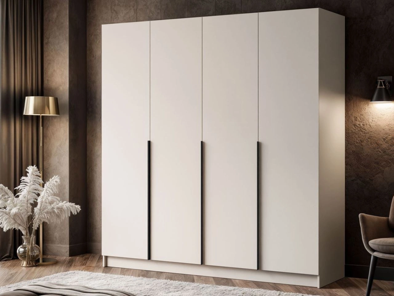 Viertürige Kleiderschrank Ameli verfügt über einen Korpus aus hochwertiger laminierter Möbelplatte in einem neutralen, Kaschmir-Farbton, der perfekt mit den glatten, matten Fronten harmoniert und ein stimmiges, dezentes Gesamtbild schafft. Lange, vertikale Griffe in Schwarz verleihen dem Möbelstück einen modernen Charakter und elegante Ausstrahlung, während sie gleichzeitig seine schlanke Form betonen. Die Kanten des Schranks sind mit ABS-Umleimung versehen, die sie vor Beschädigungen, Feuchtigkeit und Abrieb schützt und für eine lange Lebensdauer sowie ein gepflegtes Erscheinungsbild sorgt.