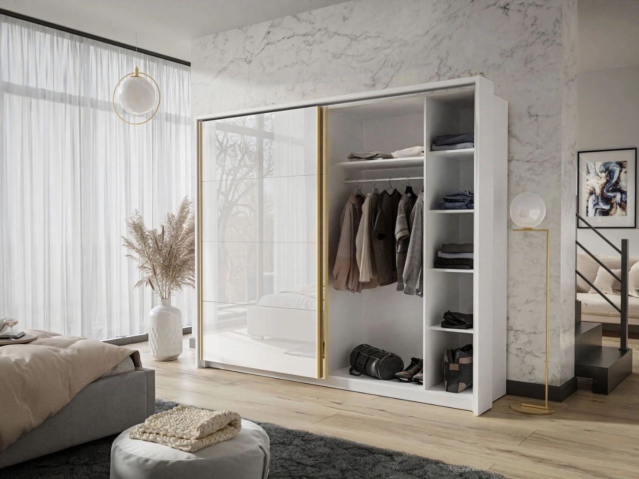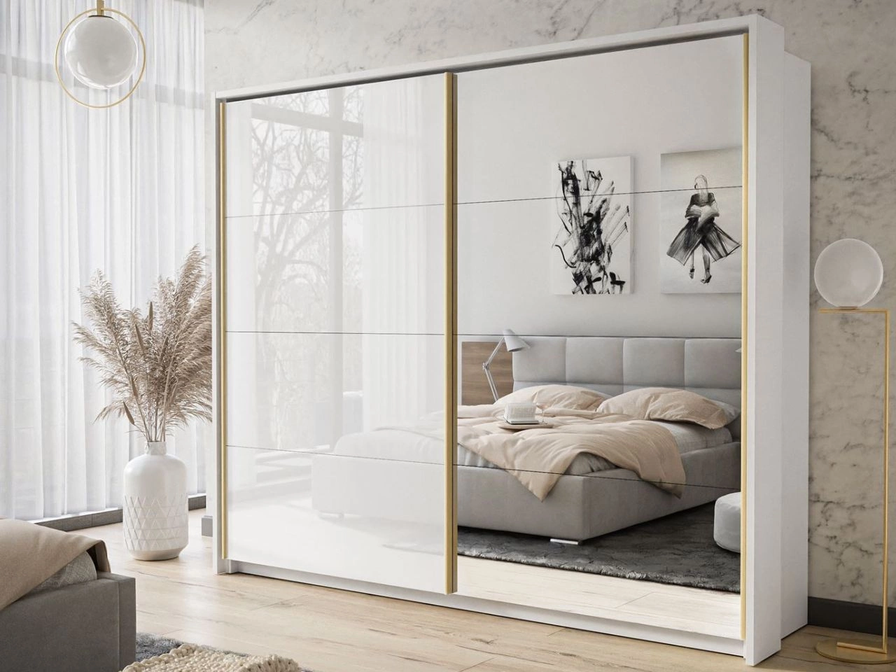 Eine Tür des Schranks ist vollständig mit einem Spiegel versehen, der den Raum optisch vergrößert und Tiefe verleiht, während die andere Tür in Weiß Hochglanz ausgeführt ist, wodurch ein eleganter Kontrast entsteht und der moderne Charakter des Möbelstücks betont wird. Goldene Akzente entlang der Kanten verleihen zusätzliche Eleganz, und stabile Führungsschienen sorgen für ein sanftes Verschieben der Türen.