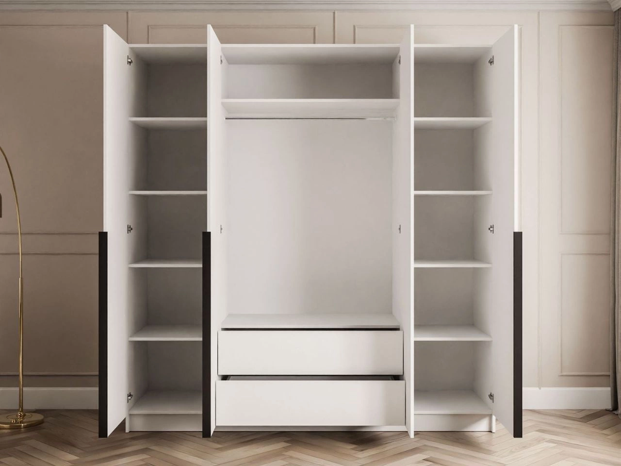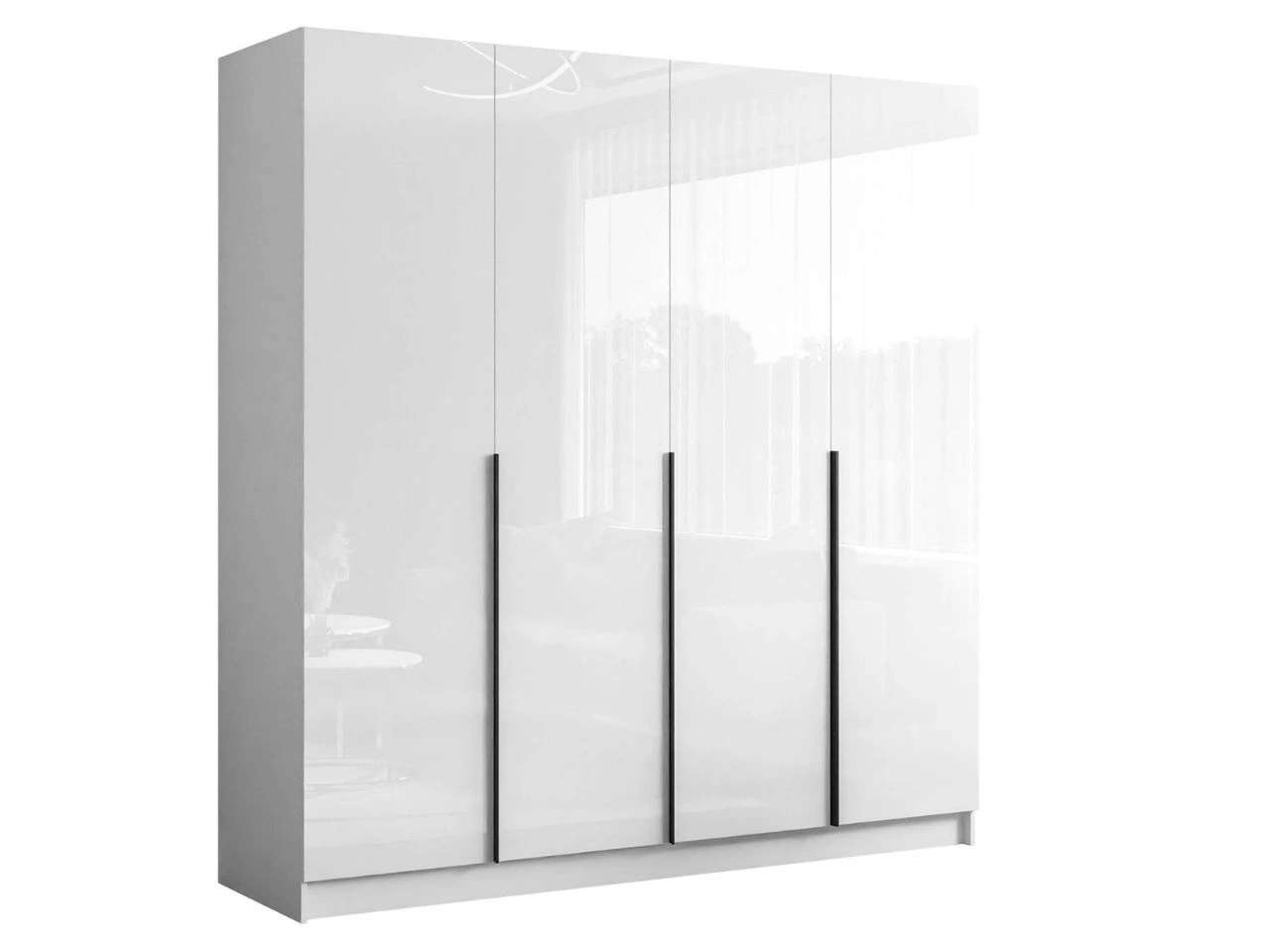 Viertüriger Kleiderschrank mit Drehtüren und schwarzen Griffen Ameli Weiß Hochglanz