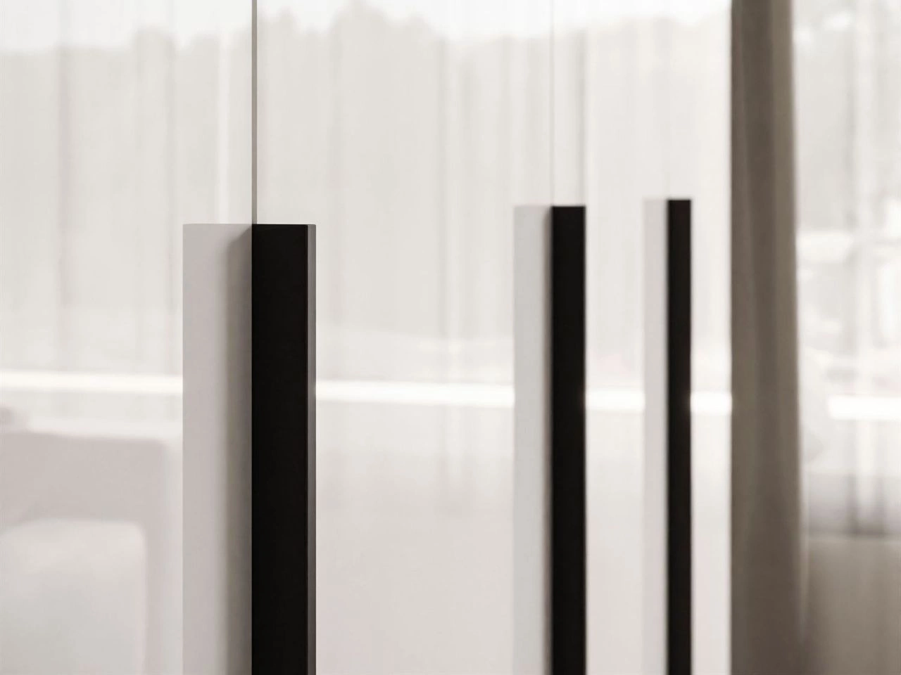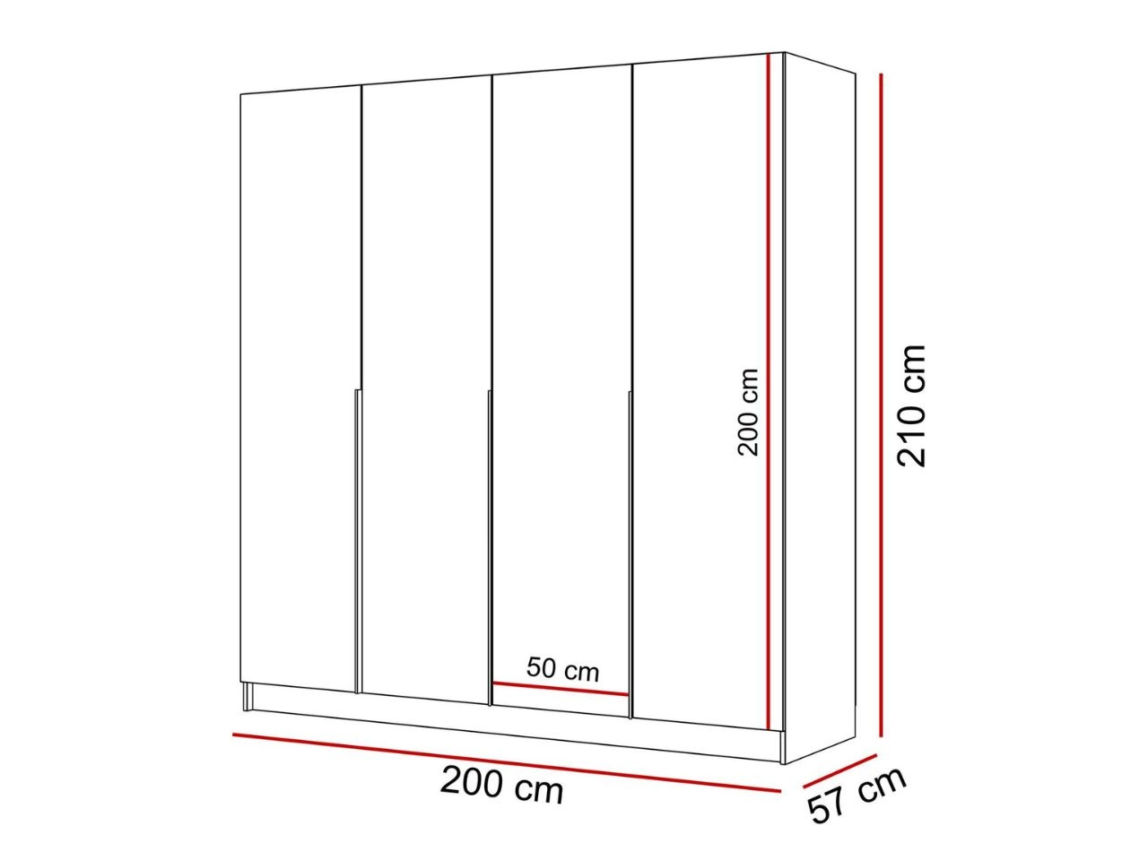 Viertürige Kleiderschrank Ameli verfügt über einen Korpus aus hochwertiger laminierter Möbelplatte in weißer Farbe, der perfekt mit den glatten, glänzenden Fronten harmoniert und ein stimmiges Gesamtbild schafft. Lange, vertikale Griffe in Schwarz verleihen dem Möbelstück einen modernen Charakter und eine elegante Ausstrahlung, während sie gleichzeitig seine schlanke Form betonen. Die Kanten des Schranks sind mit ABS-Umleimung versehen, die sie vor Beschädigungen, Feuchtigkeit und Abrieb schützt und für eine lange Lebensdauer sowie ein gepflegtes Erscheinungsbild sorgt.