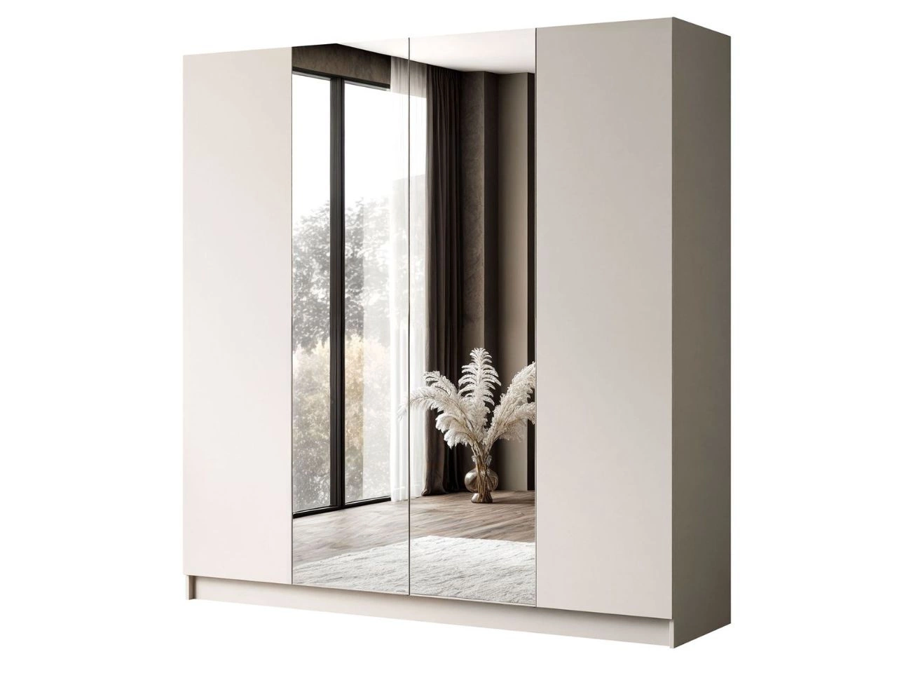 Viertürige Kleiderschrank Ameli verfügt über einen Korpus aus hochwertiger, laminierter Möbelplatte in einem neutralen Kaschmirton, der perfekt mit den glatten, matten Fronten harmoniert. Auf den Fronten befinden sich zwei Spiegel, die ein stimmiges, dezentes Gesamtbild schaffen. Der Schrank ist mit einem modernen PUSH-TO-OPEN-System ausgestattet, das ein Öffnen der Türen durch leichtes Drücken ermöglicht – ganz ohne Griffe. Der Federmechanismus drückt die Front nach vorne, und durch erneutes Andrücken schließt und verriegelt sich das Möbelstück wieder. Der Verzicht auf Griffe verleiht dem Schrank einen modernen Charakter und eine elegante Ausstrahlung. Die Kanten des Schranks sind mit ABS-Kantenumleimung versehen, die sie vor Beschädigungen, Feuchtigkeit und Abrieb schützt und so für Langlebigkeit und ein ästhetisches Erscheinungsbild sorgt.