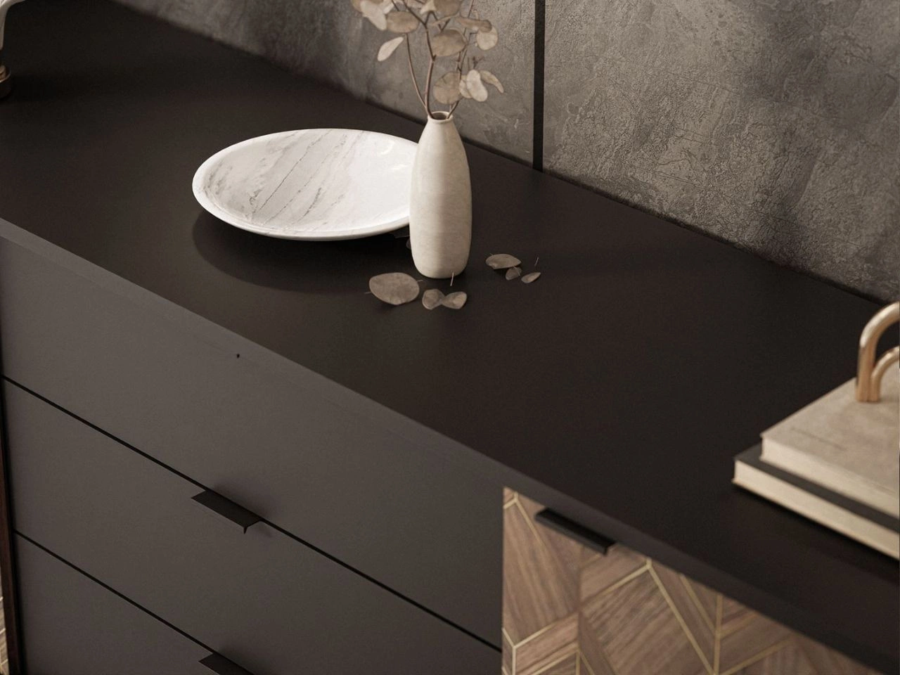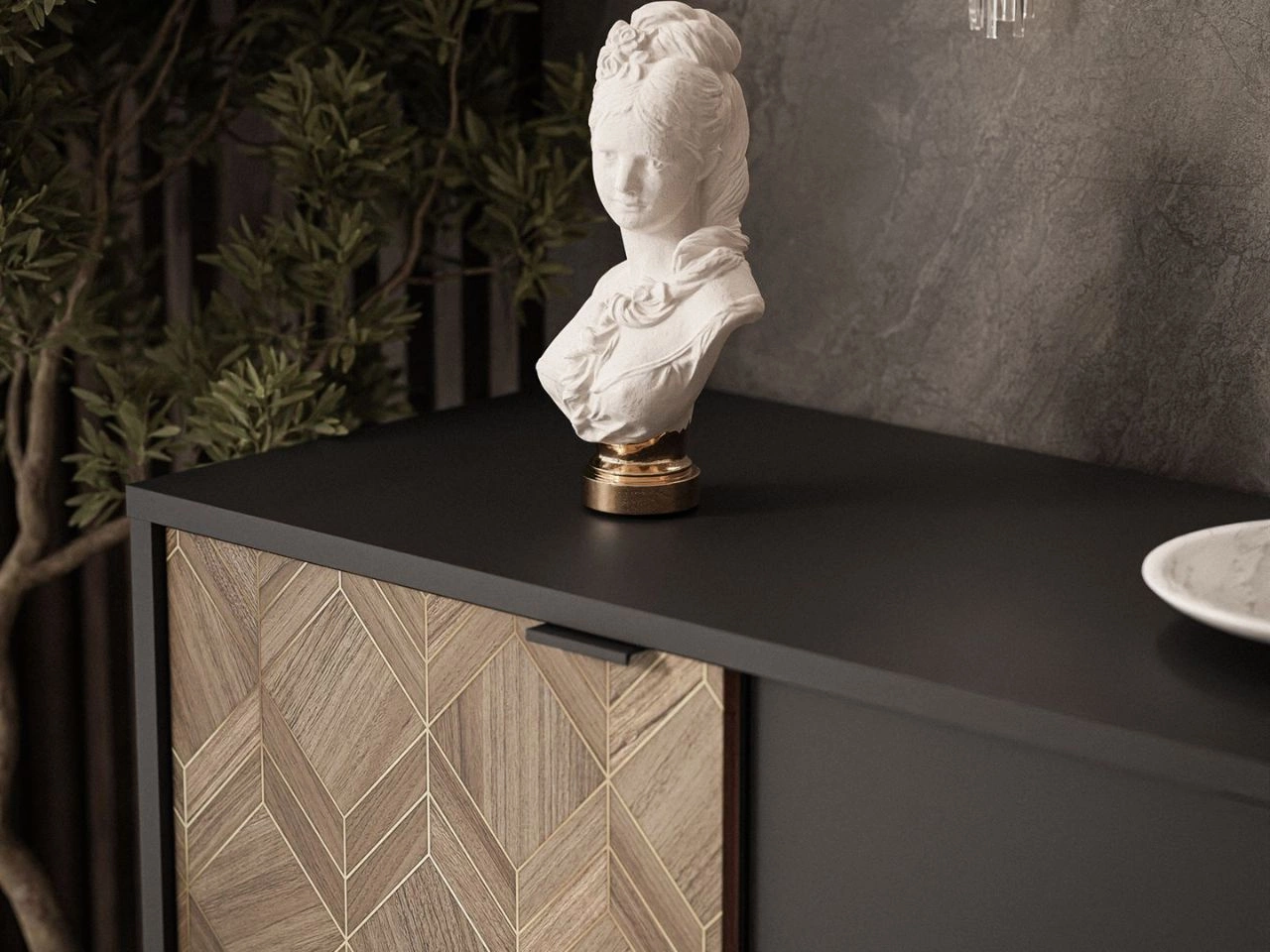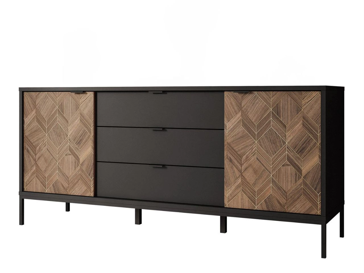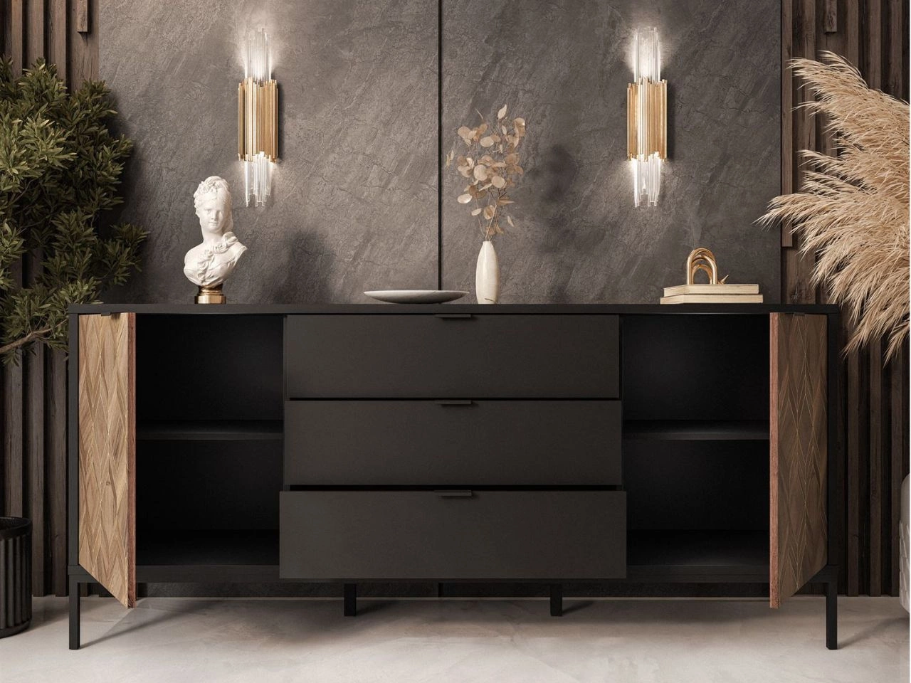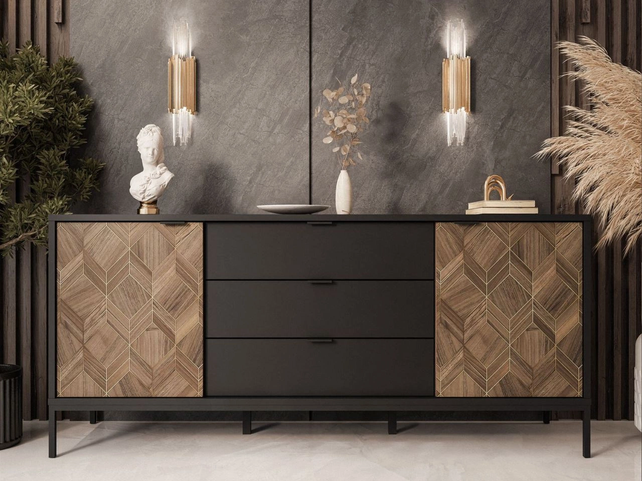 Sideboard mit Türen und Schubladen Tavio bietet zwei geräumige Schränke mit insgesamt vier Einlegeböden sowie drei große Schubladen. Das Möbelstück steht auf schlanken, schwarzen Beinen, was ihm visuelle Leichtigkeit verleiht und die Form leicht über dem Boden schweben lässt. Der Korpus in mattem Schwarz kontrastiert mit den dekorativen Fronten der Seitenschränke, die aus Laminat in warmen Farbtönen gefertigt sind und ein geometrisches Muster mit goldenen Akzenten aufweisen.