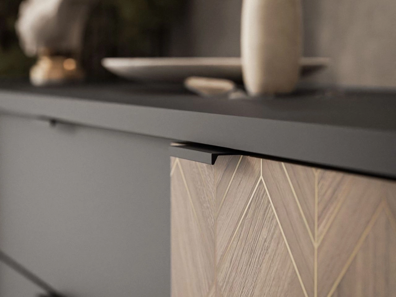 Front des Möbels wird durch das Dekor Tavio Gold geschmückt, das sich durch feine, goldene Fräsungen auszeichnet und der Oberfläche dreidimensionale Tiefe verleiht. Der dezente, warme Goldton bricht die Schlichtheit der Form und bringt eine Note von raffinierter Eleganz und Originalität in das Design. Der eingesetzte Soft-Close-Mechanismus sorgt dafür, dass Türen und Schubladen sanft und geräuschlos schließen, was nicht nur den täglichen Nutzungskomfort erhöht, sondern auch eine harmonische Atmosphäre im Raum schafft.