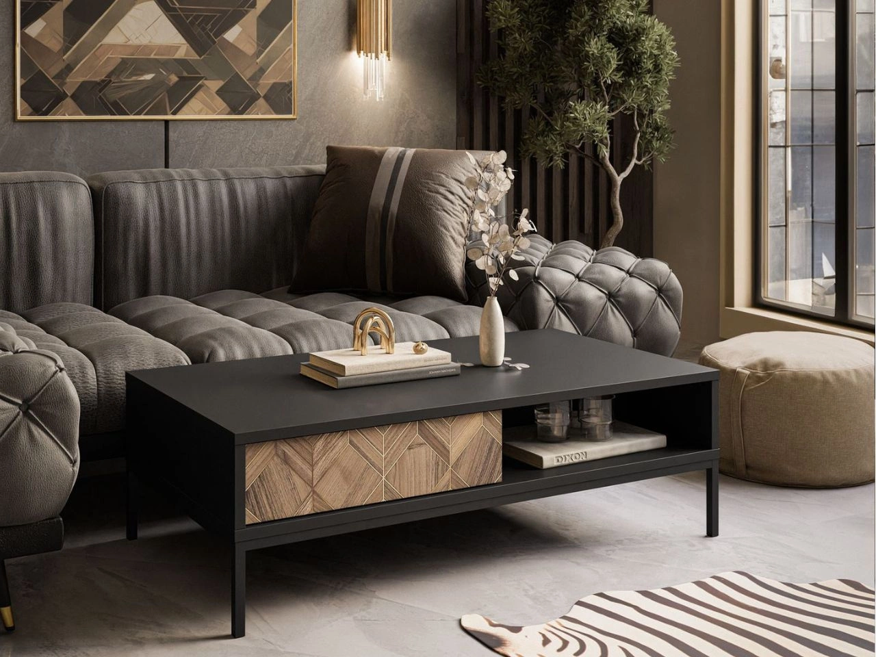 Couchtisch mit Schublade Tavio wurde mit Blick auf Benutzerfreundlichkeit entworfen. Er ist mit einem praktischen offenen Fach für Zeitschriften, Bücher oder Dekorationen sowie mit einer geräumigen Schublade ausgestattet, in der kleine Gegenstände aufbewahrt werden können, um Ordnung im Wohnbereich zu schaffen. Der Korpus des Tisches hat eine rechteckige Form und steht auf schlanken, schwarzen Metallbeinen, was ihm visuelle Leichtigkeit verleiht und die Reinigung unter dem Möbel erleichtert. Die Schublade des Tisches verfügt über ein griffloses Öffnungssystem PUSH TO OPEN. Der Korpus besteht aus schwarzer, matter laminierter Platte, was dem Ganzen einen modernen, minimalistischen Charakter verleiht.