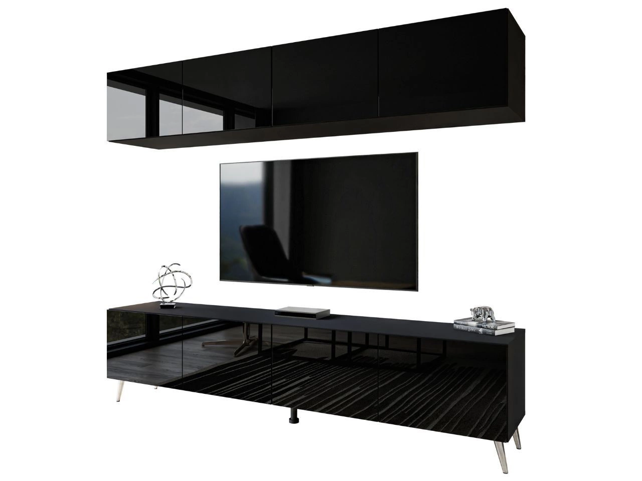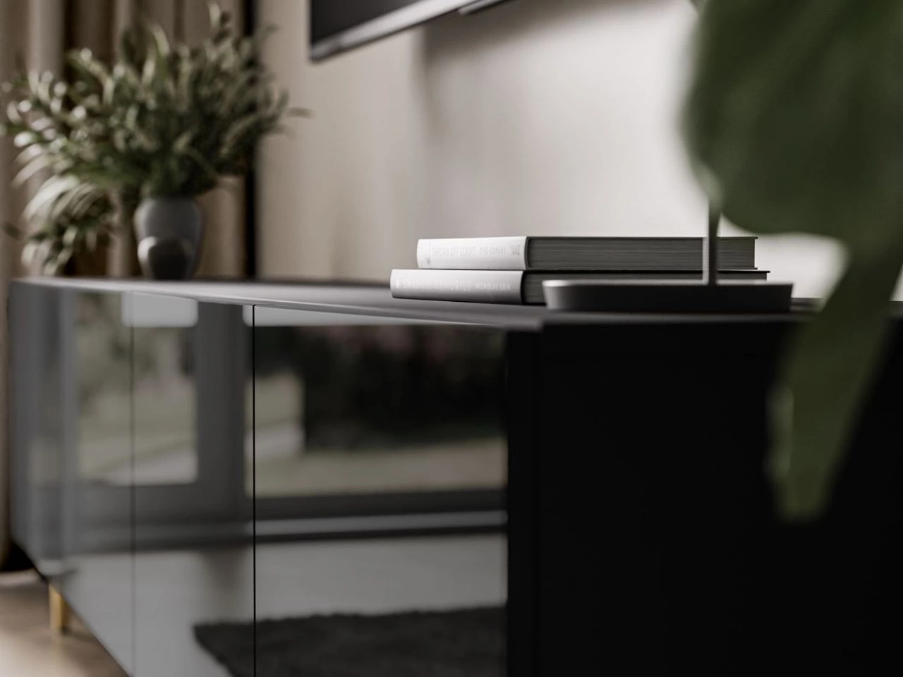 Die stabile Konstruktion der TV-Wohnwand wird durch schlanke, schräg gestellte Metallfüße unterstützt, die Leichtigkeit verleihen und die Reinigung erleichtern. PUSH-TO-OPEN-System ermöglicht das Öffnen der Fronten ohne Griffe und fügt sich perfekt in die modernen Trends des Möbeldesigns mit glatten, minimalistischen Oberflächen ein.