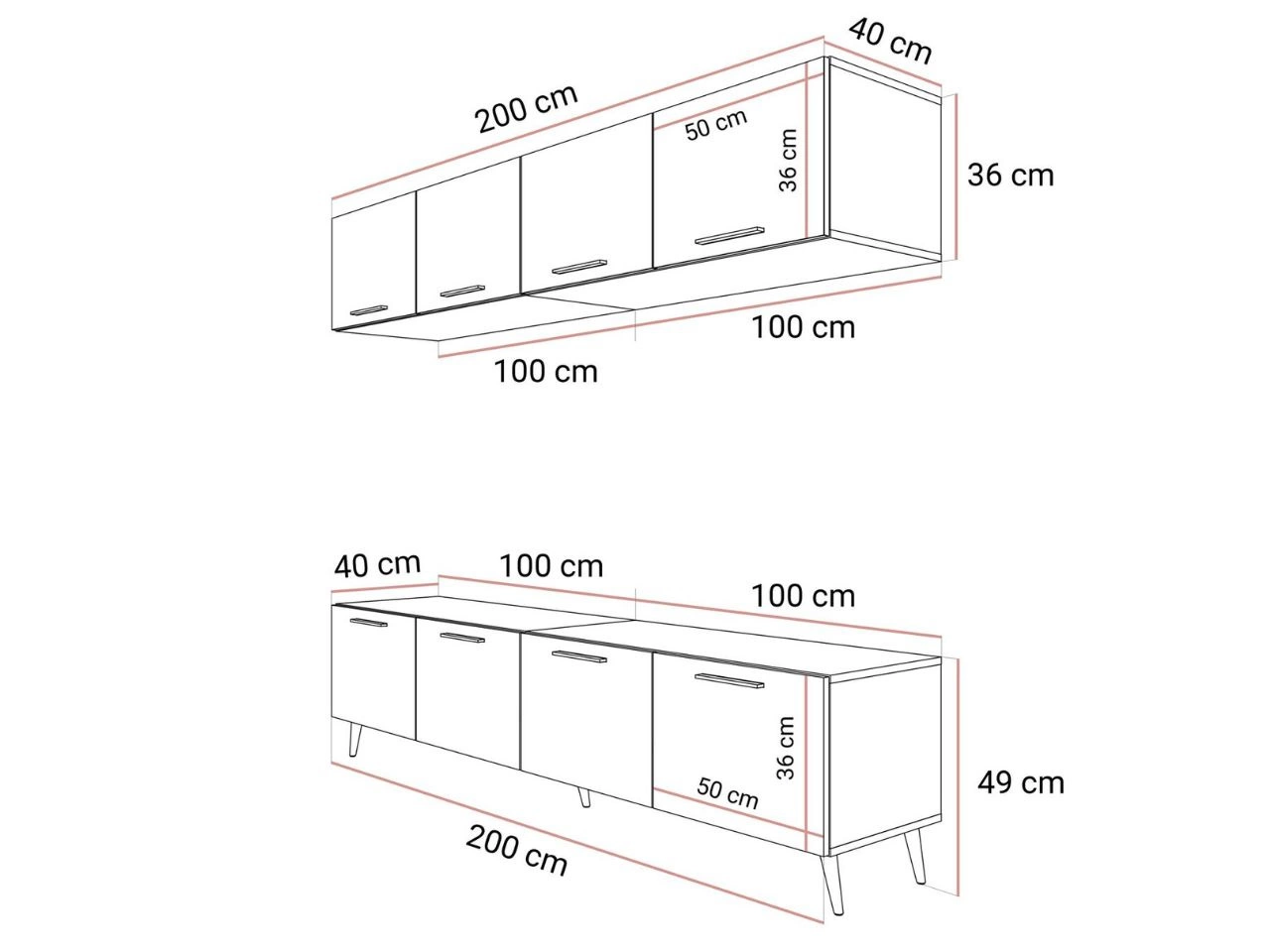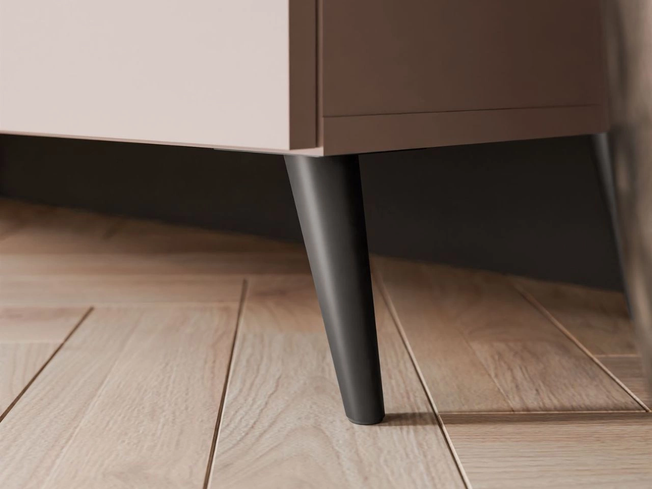 Die stabile Konstruktion der TV-Wohnwand wird von schlanken, schrägen Metallfüßen getragen, die dem Ganzen Leichtigkeit verleihen und das Reinigen erleichtern. Dezente Griffe sorgen für Komfort bei der Nutzung und unterstreichen die minimalistische, elegante Linie des Sets.