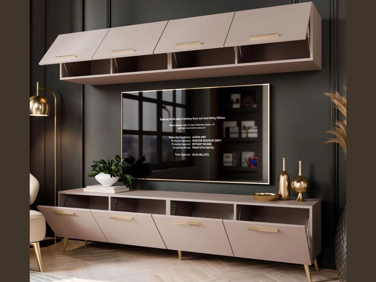 Wohnwand für das Wohnzimmer mit LED-Beleuchtung auf Goldenen Metallbeinen Noaé Kaschmir