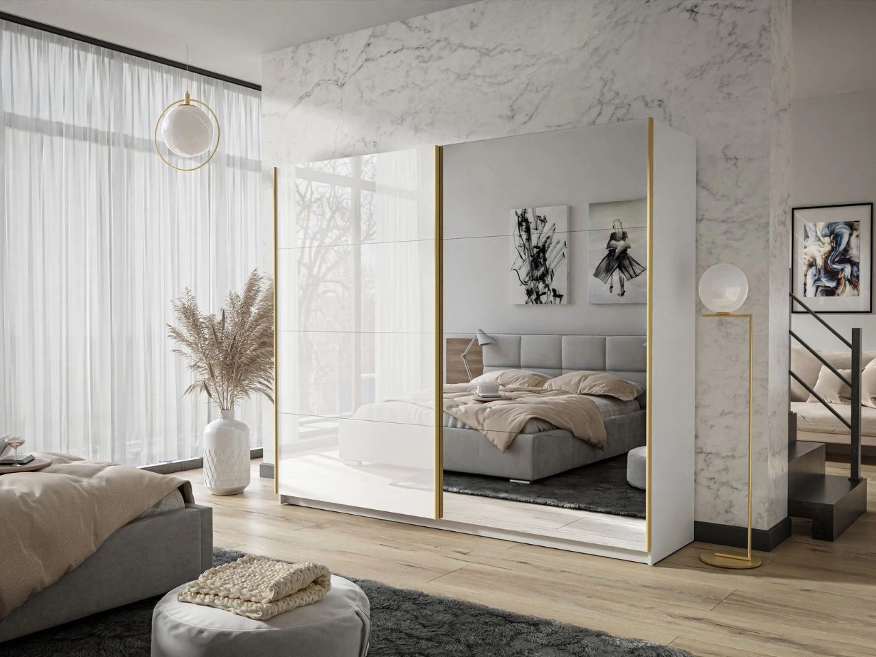 Eine Tür des Schranks ist vollständig mit einem Spiegel versehen, der den Raum optisch vergrößert und Tiefe verleiht, während die andere Tür in Weiß Hochglanz ausgeführt ist, wodurch ein eleganter Kontrast entsteht und der moderne Charakter des Möbelstücks betont wird. Goldene Akzente entlang der Kanten verleihen zusätzliche Eleganz, und stabile Führungsschienen sorgen für ein sanftes Verschieben der Türen.