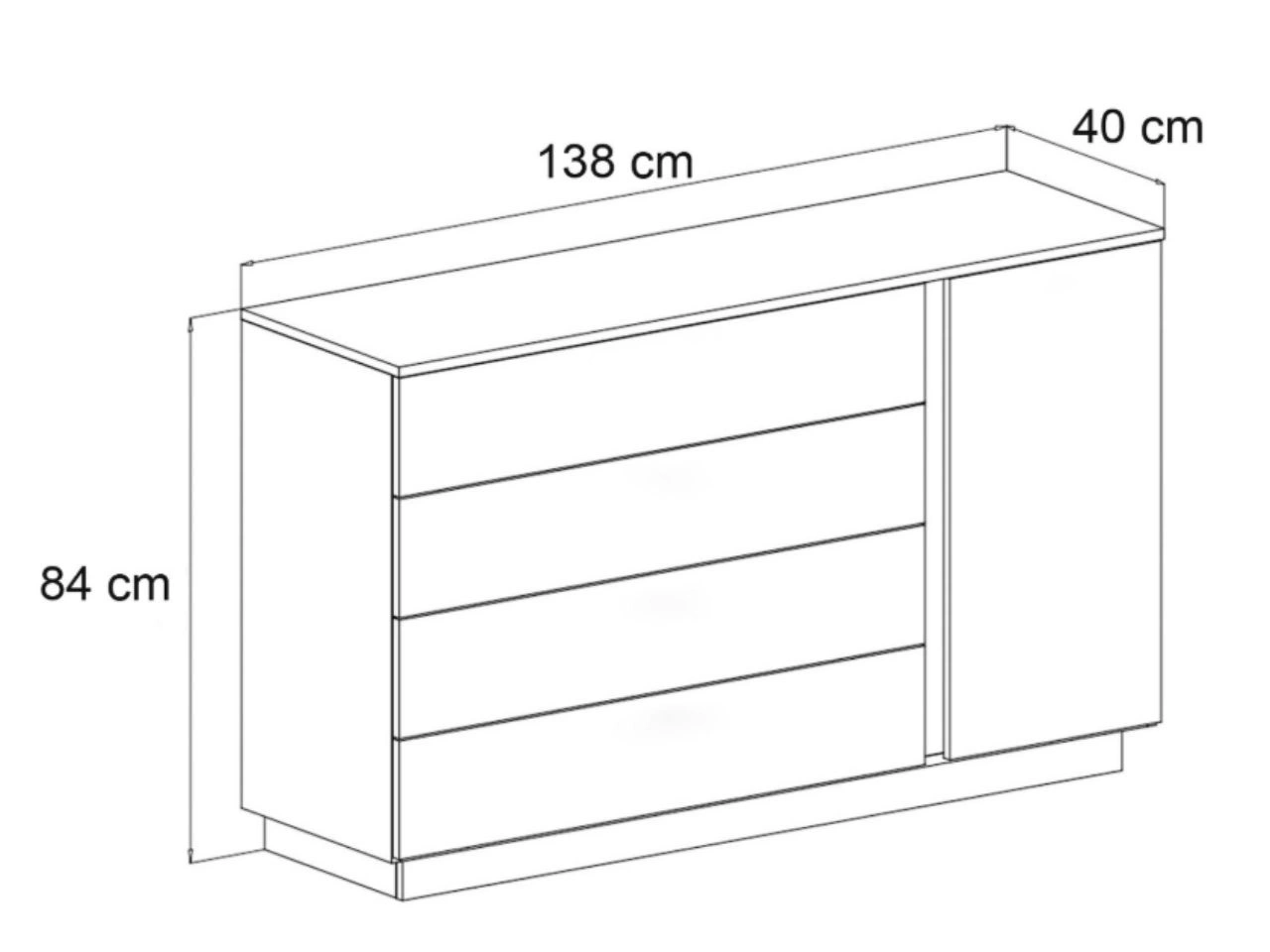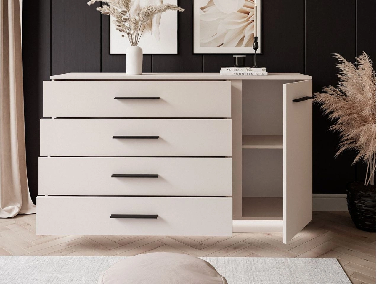 Breite Kommode verfügt über vier geräumige Schubladen sowie einen vertikalen Schrank mit Einlegeboden, was die praktische Aufbewahrung von Kleidung, Dokumenten, Accessoires oder Kleinigkeiten ermöglicht. Die großzügige Ablagefläche bietet zusätzlichen Platz für Dekorationen, Familienfotos und Erinnerungsstücke.