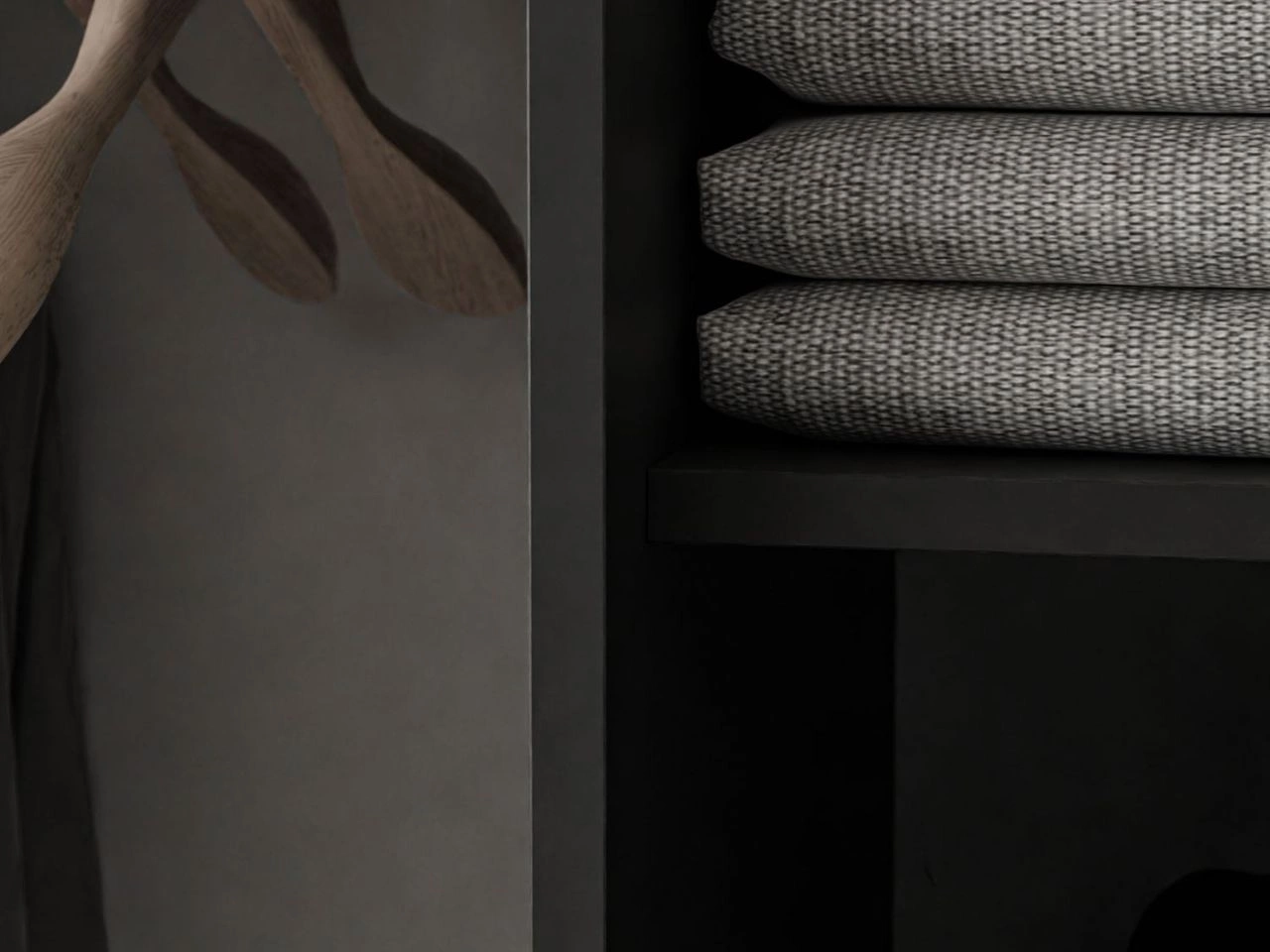 Innere des Schranks ist in zwei symmetrische Bereiche unterteilt, mit geräumigen Regalen und einer Kleiderstange, wodurch Kleidung, Accessoires und Utensilien bequem aufbewahrt werden können. Diese durchdachte Aufteilung sorgt für Ordnung und einfachen Zugriff auf alle Kleidungsstücke.