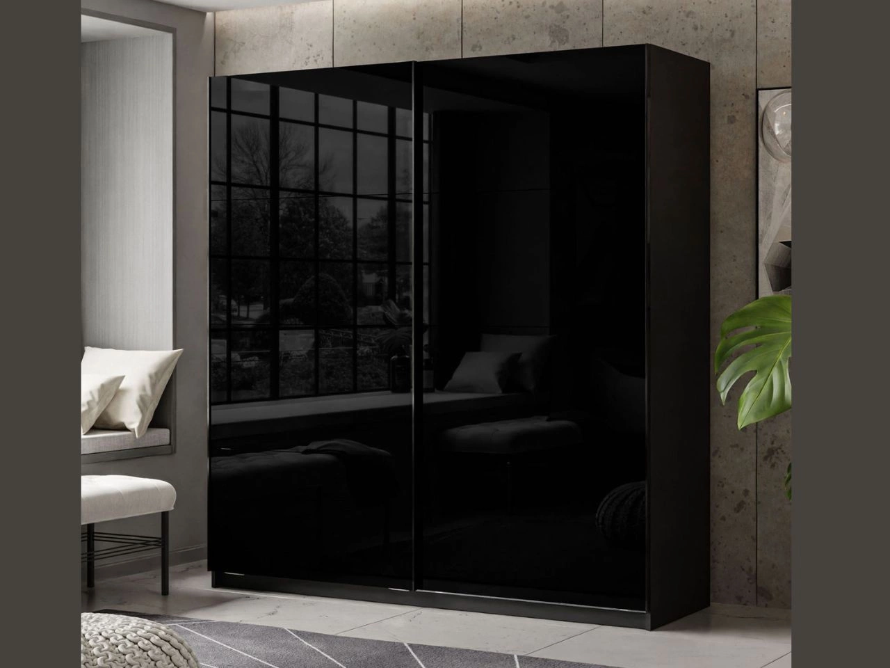 Dieser moderne Schiebetürenschrank passt perfekt sowohl ins Schlafzimmer als auch ins Wohnzimmer. Der gesamte Schrank ist in hochglänzendem Schwarz ausgeführt, was dem Raum ein elegantes und modernes Aussehen verleiht. Dank robuster Schienen lassen sich die Türen sanft und leise verschieben, was Platz spart und die tägliche Nutzung erleichtert.