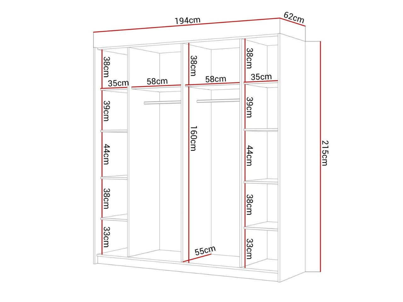 Dieser moderne Schiebetürenschrank passt perfekt sowohl ins Schlafzimmer als auch ins Wohnzimmer. Fronten des Schranks sind vollständig verspiegelt, was den Raum optisch vergrößert und ihm einen eleganten, modernen Charakter verleiht. Dank robuster Schienen lassen sich die Türen sanft und leise verschieben, was Platz spart und die tägliche Nutzung erleichtert.