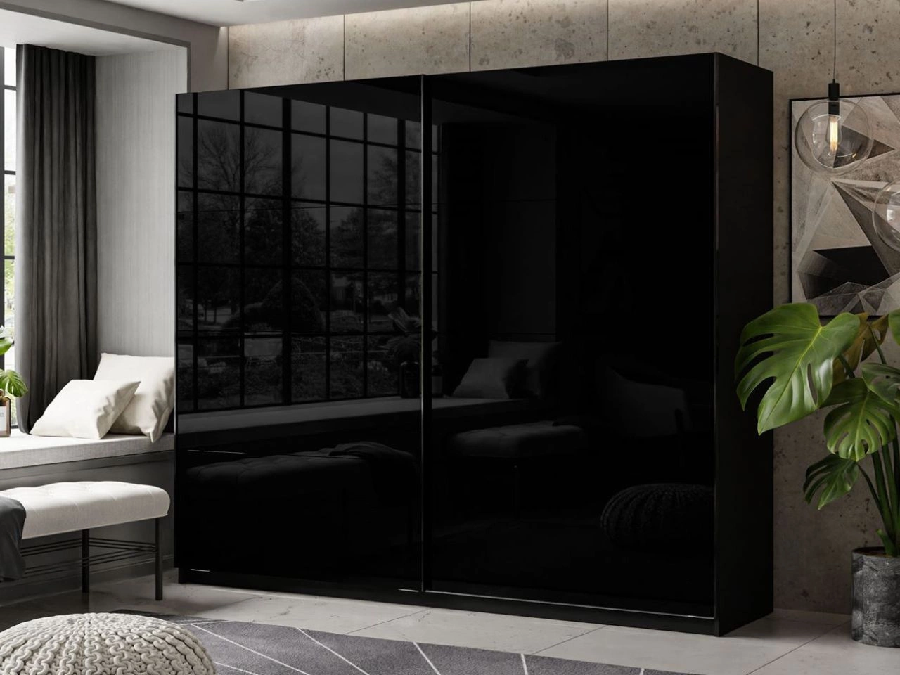 Dieser moderne Schiebetürenschrank passt perfekt sowohl ins Schlafzimmer als auch ins Wohnzimmer. Der gesamte Schrank ist in hochglänzendem Schwarz ausgeführt, was dem Raum ein elegantes und modernes Aussehen verleiht. Dank robuster Schienen lassen sich die Türen sanft und leise verschieben, was Platz spart und die tägliche Nutzung erleichtert.