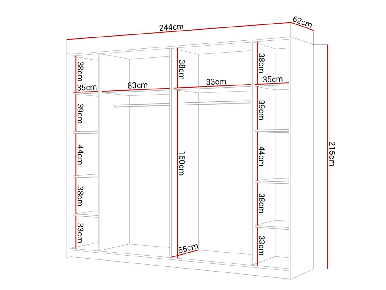 Innere des Schranks ist in zwei symmetrische Bereiche unterteilt, mit geräumigen Regalen und einer Kleiderstange, wodurch Kleidung, Accessoires und Utensilien bequem aufbewahrt werden können. Diese durchdachte Aufteilung sorgt für Ordnung und einfachen Zugriff auf alle Kleidungsstücke.