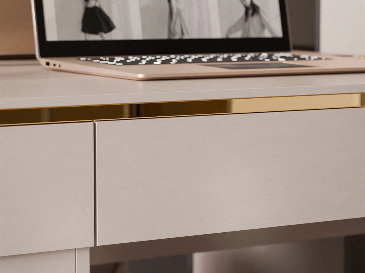 Schreibtisch Evare ist ein zeitgemäßes Möbelstück, das Stil, Funktionalität und hohe Verarbeitungsqualität vereint. Dank seiner minimalistischen Form und der modernen Farbgebung in Kaschmir Matt passt er perfekt ins Homeoffice, Jugendzimmer oder in ein stilvolles Arbeitszimmer. Ein goldenes Designelement unterstreicht den eleganten Charakter des Möbelstücks und zieht die Blicke auf sich.
