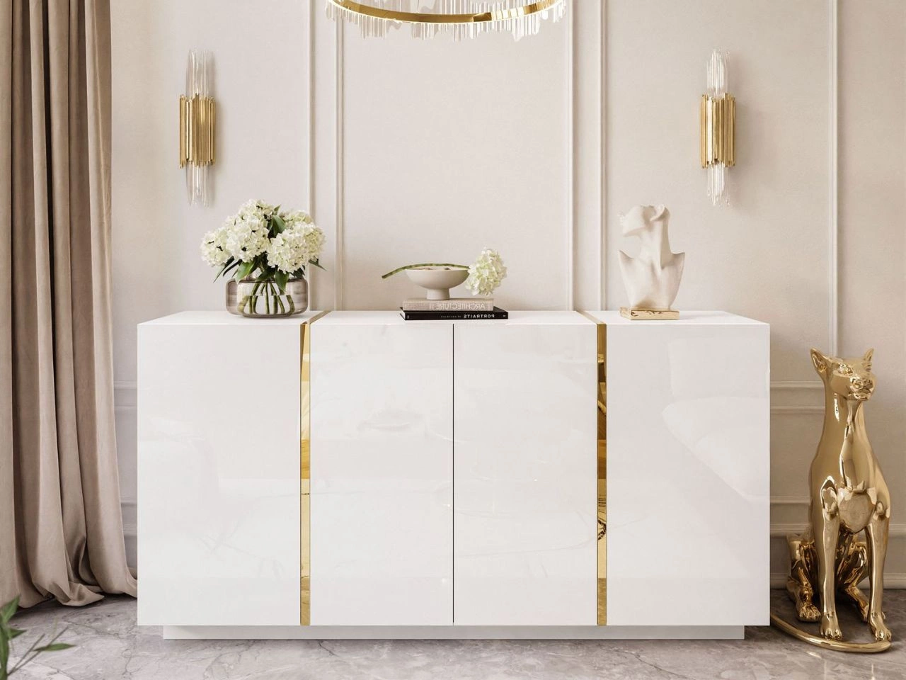Die breite weiße Kommode Lunelie eignet sich nicht nur als Stauraummöbel, sondern dank ihrer großzügigen Ablagefläche auch hervorragend als TV-Kommode, auf der selbst ein sehr großer Fernseher Platz findet. Das Möbelstück ist aus hochwertiger laminierter Platte gefertigt. Die Fronten sind in hochglänzendem Weiß ausgeführt, während der Korpus in mattem Weiß gehalten ist. Das elegante Design wird zusätzlich durch zwei goldene Zierleisten unterstrichen, die senkrecht zwischen den Türen angebracht sind. Die Türen verfügen über ein modernes PUSH-TO-OPEN-System, das ein griffloses Öffnen ermöglicht.