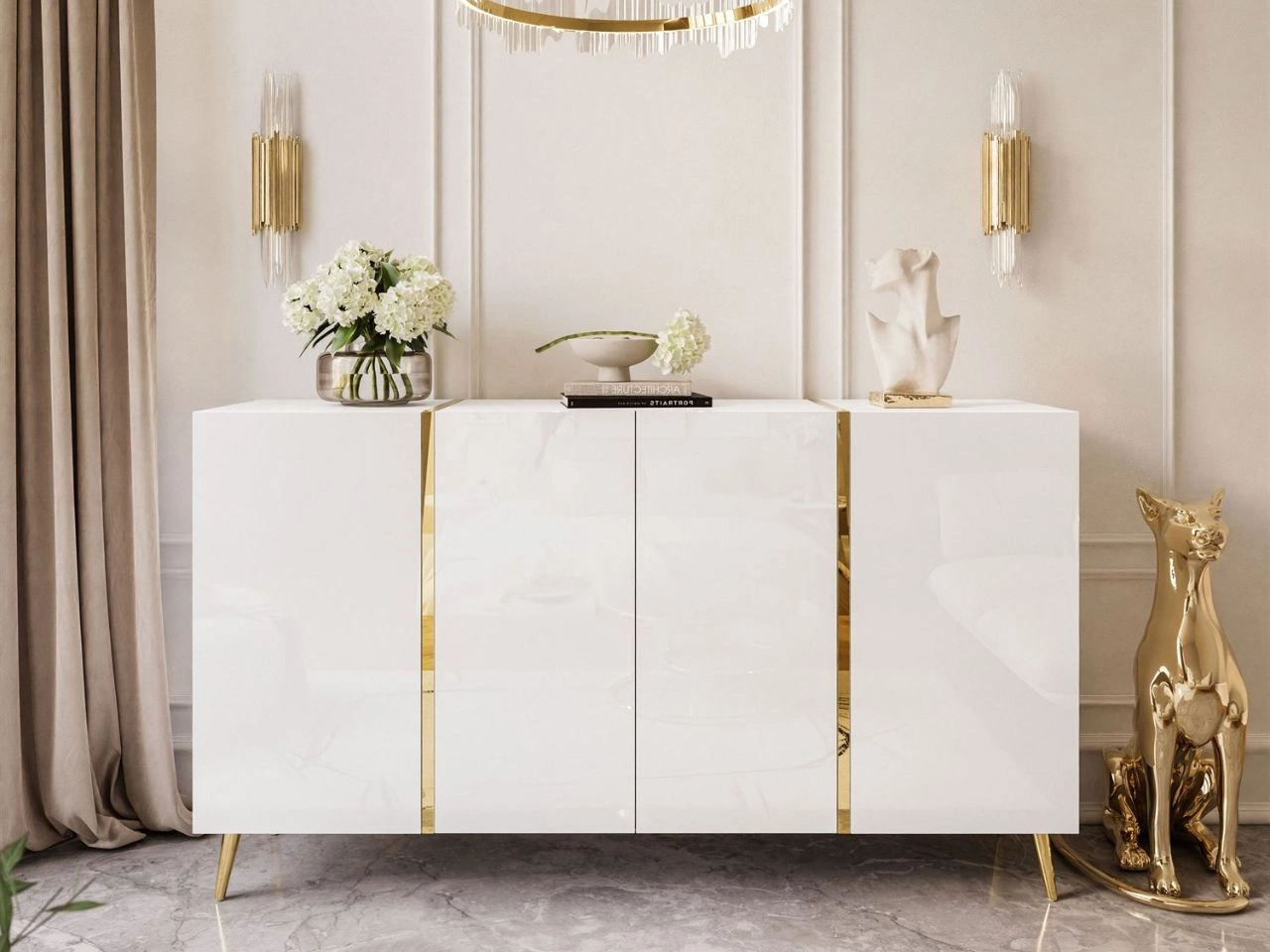 Die breite weiße Kommode Lunelie eignet sich nicht nur als Stauraummöbel, sondern dank ihrer großzügigen Ablagefläche auch hervorragend als TV-Kommode, auf der selbst ein sehr großer Fernseher Platz findet. Das Möbelstück ist aus hochwertiger laminierter Platte gefertigt. Die Fronten sind in hochglänzendem Weiß ausgeführt, während der Korpus in mattem Weiß gehalten ist. Das elegante Design wird zusätzlich durch zwei goldene Zierleisten unterstrichen, die senkrecht zwischen den Türen angebracht sind. Die Türen verfügen über ein modernes PUSH-TO-OPEN-System, das ein griffloses Öffnen ermöglicht.