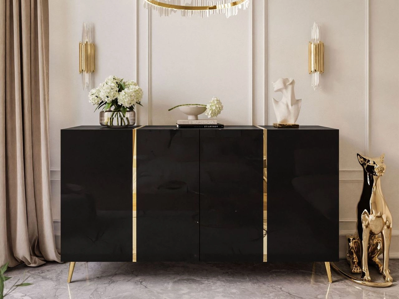 Die breite schwarze Kommode Lunelie eignet sich nicht nur als Stauraummöbel, sondern dank ihrer großzügigen Ablagefläche auch hervorragend als TV-Kommode, auf der selbst ein sehr großer Fernseher Platz findet. Das Möbelstück ist aus hochwertiger laminierter Platte gefertigt. Die Fronten sind in hochglänzendem Schwarz ausgeführt, während der Korpus in mattem Schwarz gehalten ist. Das elegante Design wird zusätzlich durch zwei goldene Zierleisten unterstrichen, die senkrecht zwischen den Türen angebracht sind. Die Türen verfügen über ein modernes PUSH-TO-OPEN-System, das ein griffloses Öffnen ermöglicht.