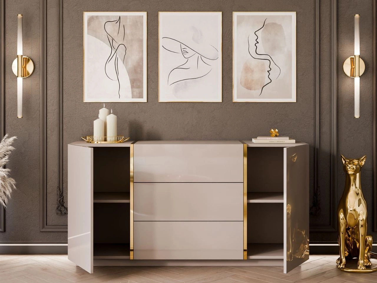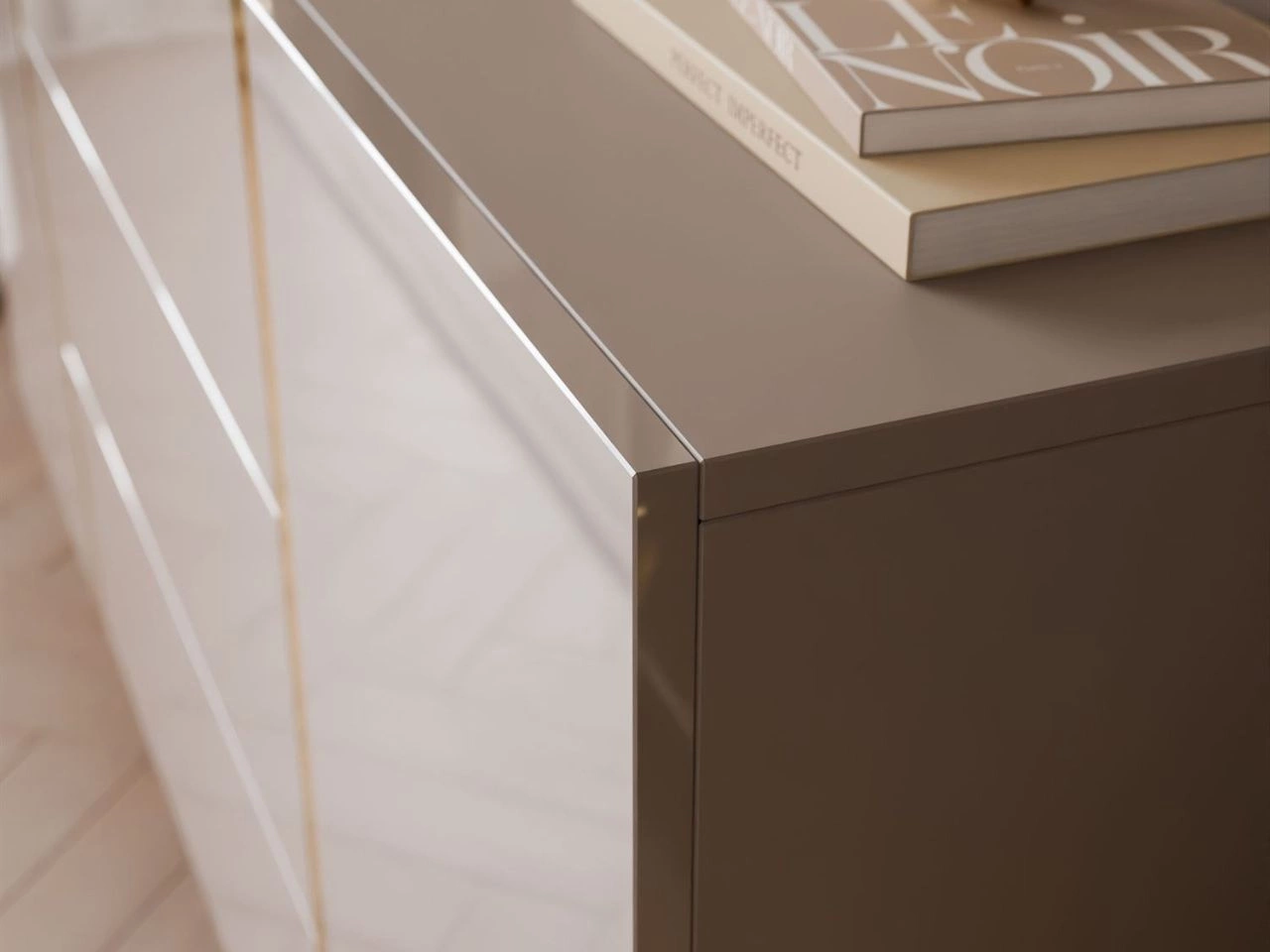 Die zweitürige Kommode in Kaschmirfarbe mit drei Schubladen Lunelie zieht auf den ersten Blick durch goldene Details in Form von goldenen Leisten Aufmerksamkeit auf sich, die über die Deckplatte und die Fronten verlaufen. Gerade diese Elemente bestimmen das besondere Design dieses Möbelstücks. Sowohl Korpus als auch Fronten bestehen aus einer hochwertigen laminierten Platte. Die Fronten sind in Hochglanz ausgeführt, der Korpus hingegen in Mattkaschmir.