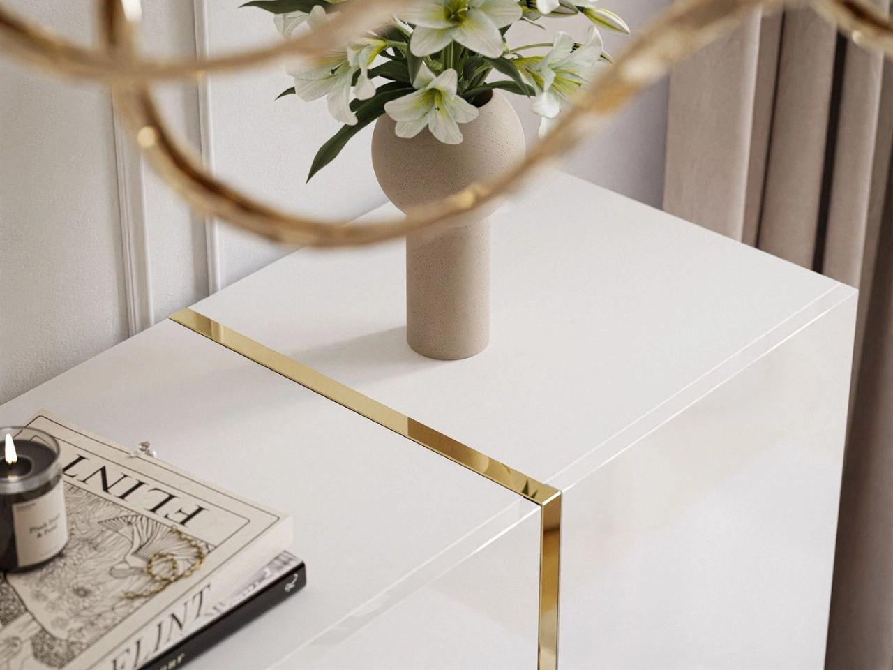Die weiße Kommode Lunelie mit zwei Türen und drei Schubladen fällt auf den ersten Blick durch ihre goldenen Details in Form von goldenen Streifen auf, die über die Oberseite und die Fronten verlaufen, sowie goldenen Metallbeinen. Gerade diese Elemente bestimmen das besondere Design dieses Möbelstücks. Sowohl Korpus als auch Fronten bestehen aus einer hochwertigen laminierten Platte. Die Fronten sind in Hochglanz ausgeführt, der Korpus hingegen in Mattweiß.