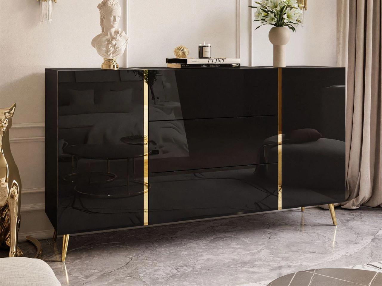 Die schwarze Kommode Lunelie mit zwei Türen und drei Schubladen fällt auf den ersten Blick durch ihre goldenen Details in Form von goldenen Streifen auf, die über die Oberseite und die Fronten verlaufen, sowie goldenen Metallbeinen. Gerade diese Elemente bestimmen das besondere Design dieses Möbelstücks. Sowohl Korpus als auch Fronten bestehen aus einer hochwertigen laminierten Platte. Die Fronten sind in Hochglanz ausgeführt, der Korpus hingegen in Mattschwarz.