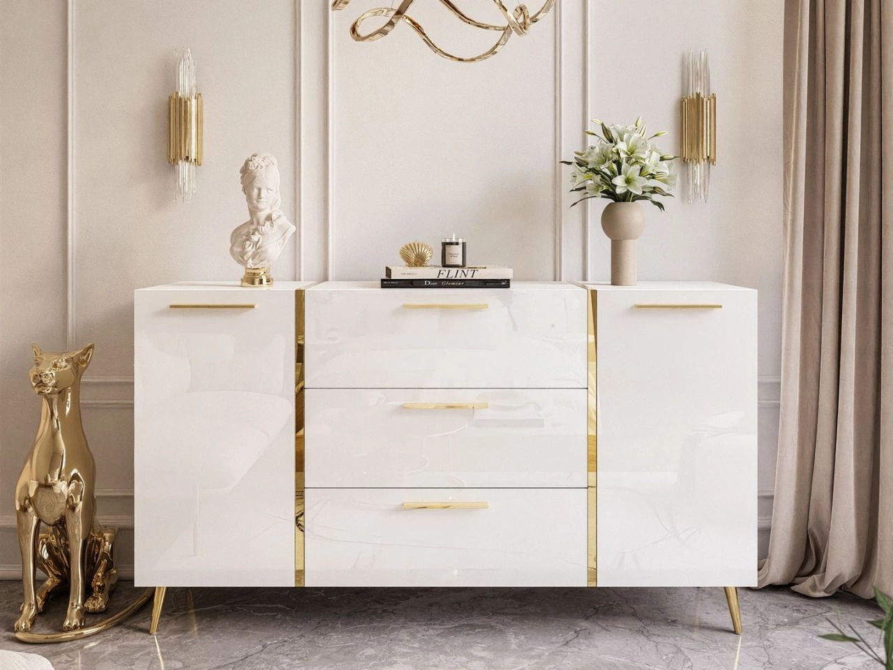 Zweitürige Kommode 158 cm mit drei Schubladen und goldenen Griffen Lunelie Weißglanz