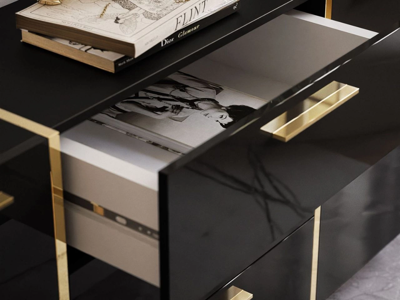 Zweitürige Kommode 158 cm mit drei Schubladen und goldenen Griffen Lunelie Schwarzglanz