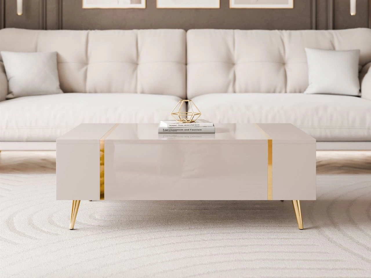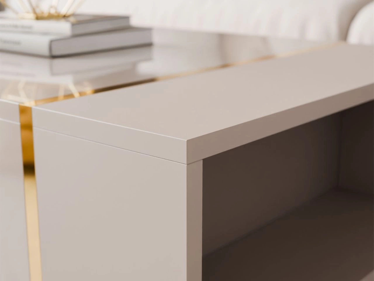 Der Couchtisch Lunelie wurde aus hochwertiger laminierter Platte gefertigt. Die Fronten sind in Kaschmir Hochglanz gehalten, während der Korpus in mattem Kaschmir ausgeführt ist. Abgerundet wird das Erscheinungsbild durch zwei goldene Zierleisten, die Tischplatte und Front schmücken. Für einen besonders eleganten Look sorgen zudem goldene Metallfüße mit einer Höhe von 13 cm.