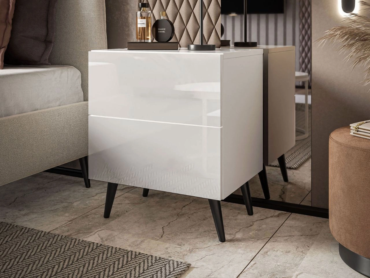Nachttisch zeichnet sich durch eine hohe Verarbeitungsqualität aus – der Korpus besteht aus robuster laminierter Platte, während die Fronten und die obere Platte in Hochglanz nicht nur Eleganz verleihen, sondern auch den Raum optisch vergrößern und aufhellen.
