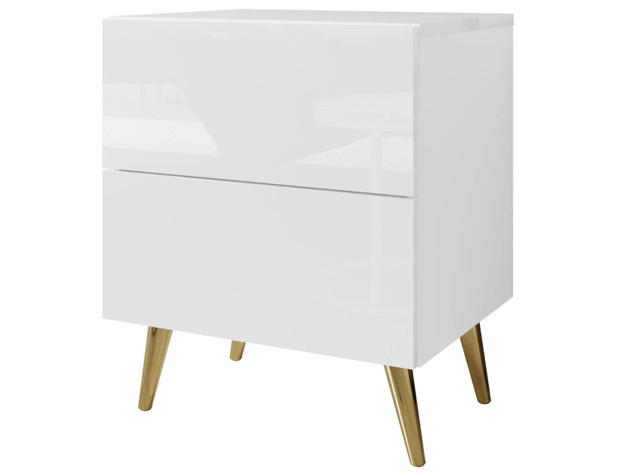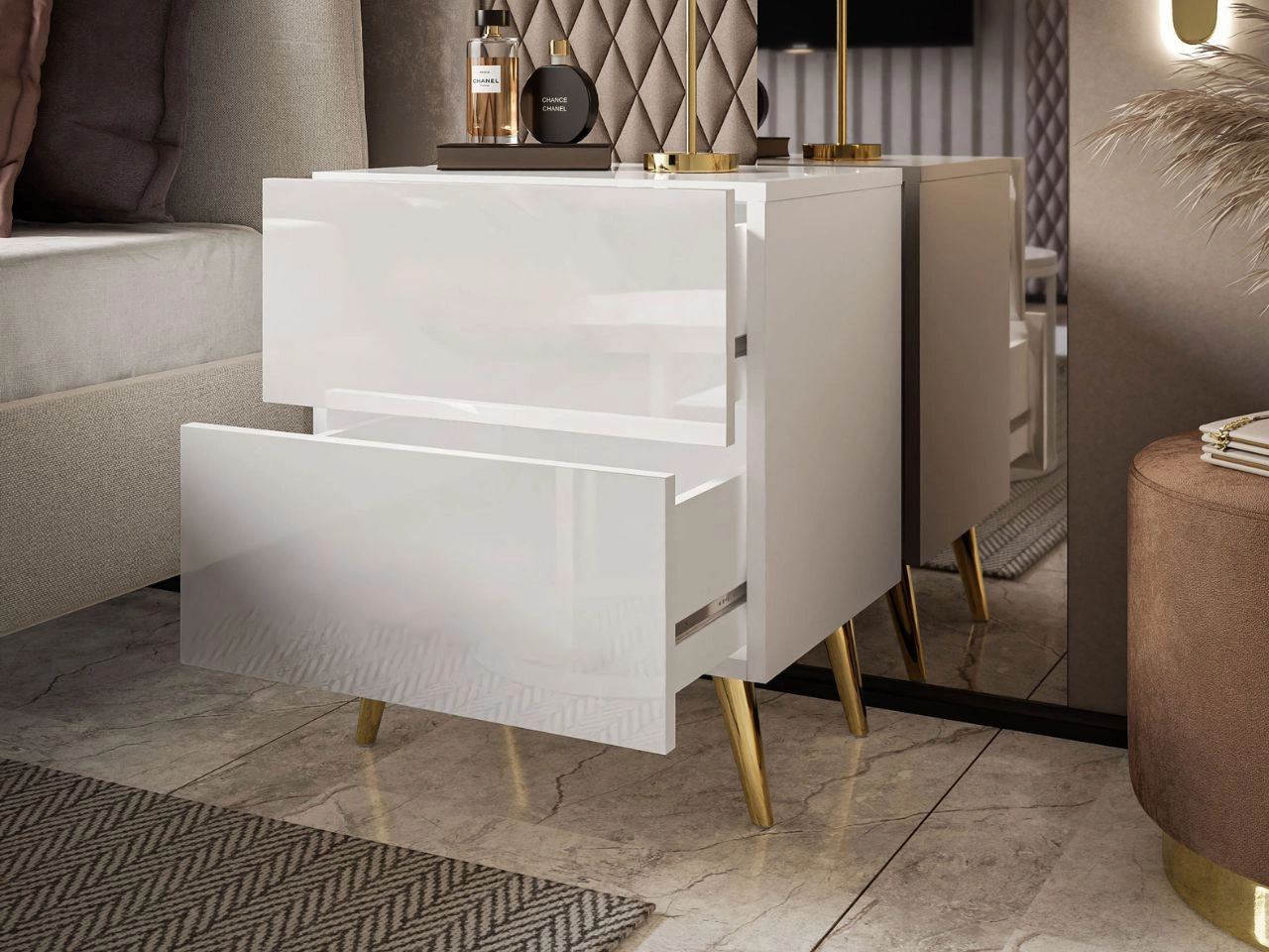 Nachttisch zeichnet sich durch eine hohe Verarbeitungsqualität aus – der Korpus besteht aus robuster laminierter Platte, während die Fronten und die obere Platte in Hochglanz nicht nur Eleganz verleihen, sondern auch den Raum optisch vergrößern und aufhellen.