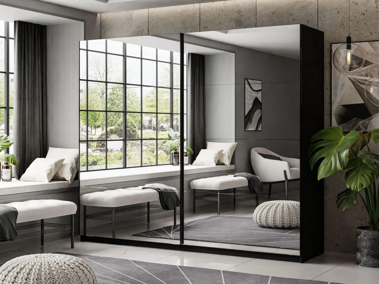 Dieser moderne Schiebetürenschrank passt perfekt sowohl ins Schlafzimmer als auch ins Wohnzimmer. Fronten des Schranks sind vollständig verspiegelt, was den Raum optisch vergrößert und ihm einen eleganten, modernen Charakter verleiht. Dank robuster Schienen lassen sich die Türen sanft und leise verschieben, was Platz spart und die tägliche Nutzung erleichtert.