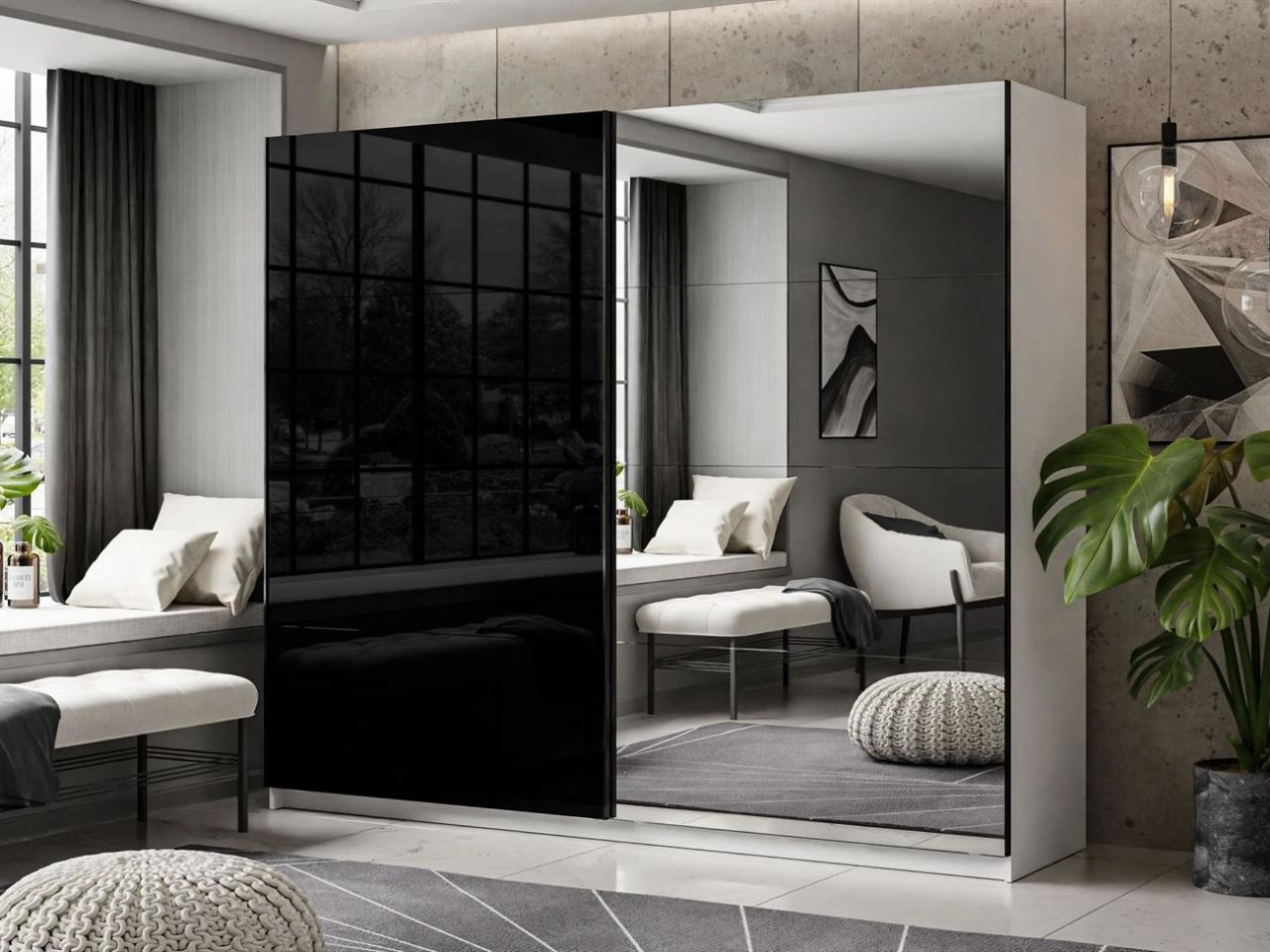 Dieser Schiebeschrank passt perfekt sowohl ins Schlafzimmer als auch ins Wohnzimmer. Eine Tür des Schranks ist mit einem Spiegel versehen, der den Raum optisch vergrößert und Tiefe verleiht, während die andere in Hochglanz gestaltet ist und so einen effektvollen Kontrast schafft. Front des Schranks ist in Schwarz gehalten, der Korpus in Weiß, was zusätzlich das elegante Erscheinungsbild betont. Dank solider Laufschienen gleiten die Türen sanft und leise, sparen Platz und erleichtern die tägliche Nutzung.
