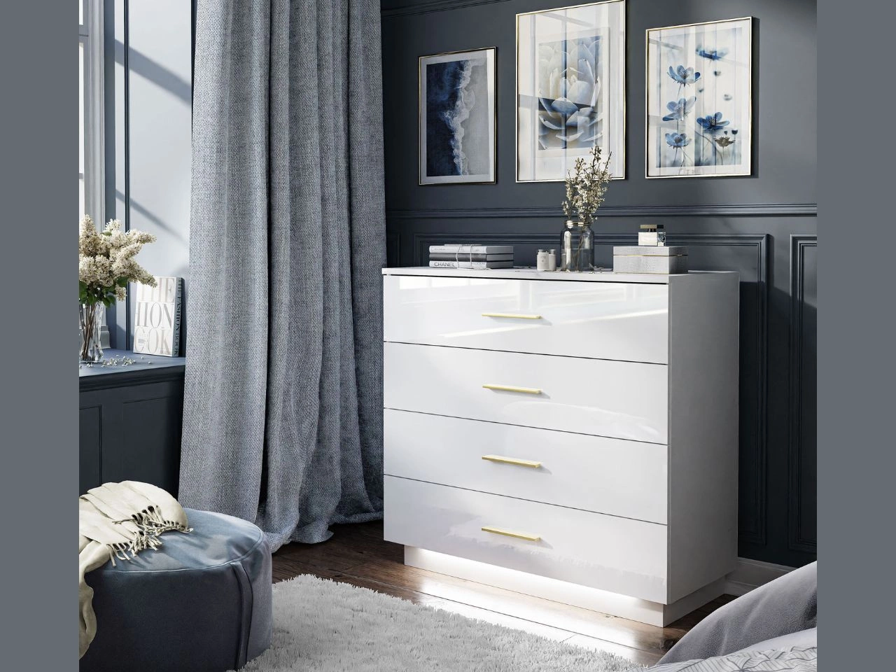 Kommode mit vier Schubladen und LED-Beleuchtung Nuveo Weiß Hochglanz