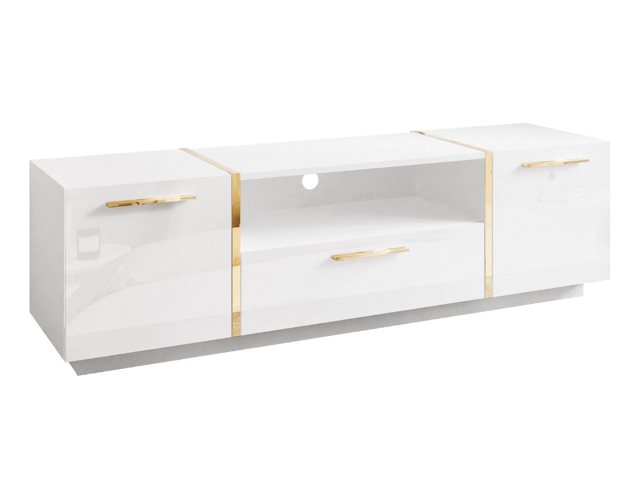 Das TV-Lowboard Lunelie verfügt über zwei Schränke und eine Schublade. Über der Schublade befindet sich ein Fach für AV-Geräte; in der Rückwand ist ein runder Ausschnitt zur ordentlichen Kabelführung vorhanden. Das elegante Design des gezeigten Möbels wird durch goldene Akzente in Form dekorativer Leisten, die über Deckplatte und Fronten verlaufen, abgerundet. Das moderne Erscheinungsbild wird durch einen minimalistischen Sockel zusätzlich betont.