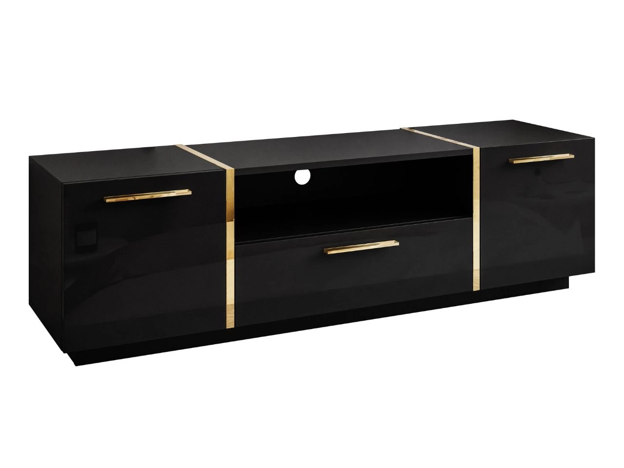 Das TV-Lowboard Lunelie verfügt über zwei Schränke und eine Schublade. Über der Schublade befindet sich ein Fach für AV-Geräte; in der Rückwand ist ein runder Ausschnitt zur ordentlichen Kabelführung vorhanden. Das elegante Design des gezeigten Möbels wird durch goldene Akzente in Form dekorativer Leisten, die über Deckplatte und Fronten verlaufen, abgerundet. Das moderne Erscheinungsbild wird durch einen minimalistischen Sockel zusätzlich betont.