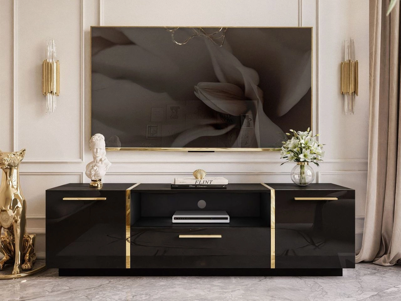 Du ziehst an: TV-Lowboard im Glamour-Stil, zweitürig mit Schublade Lunelie Schwarz Hochglanz