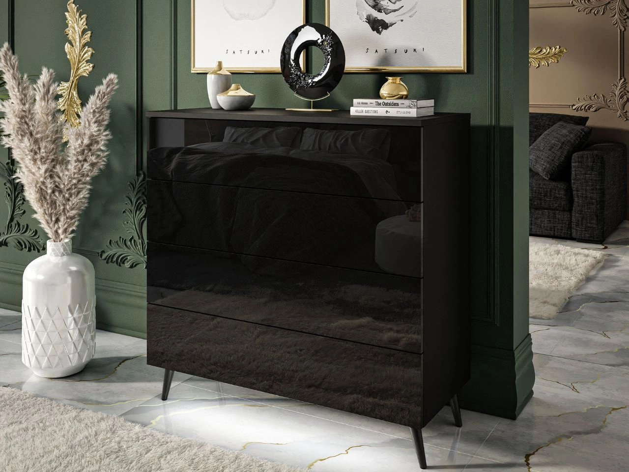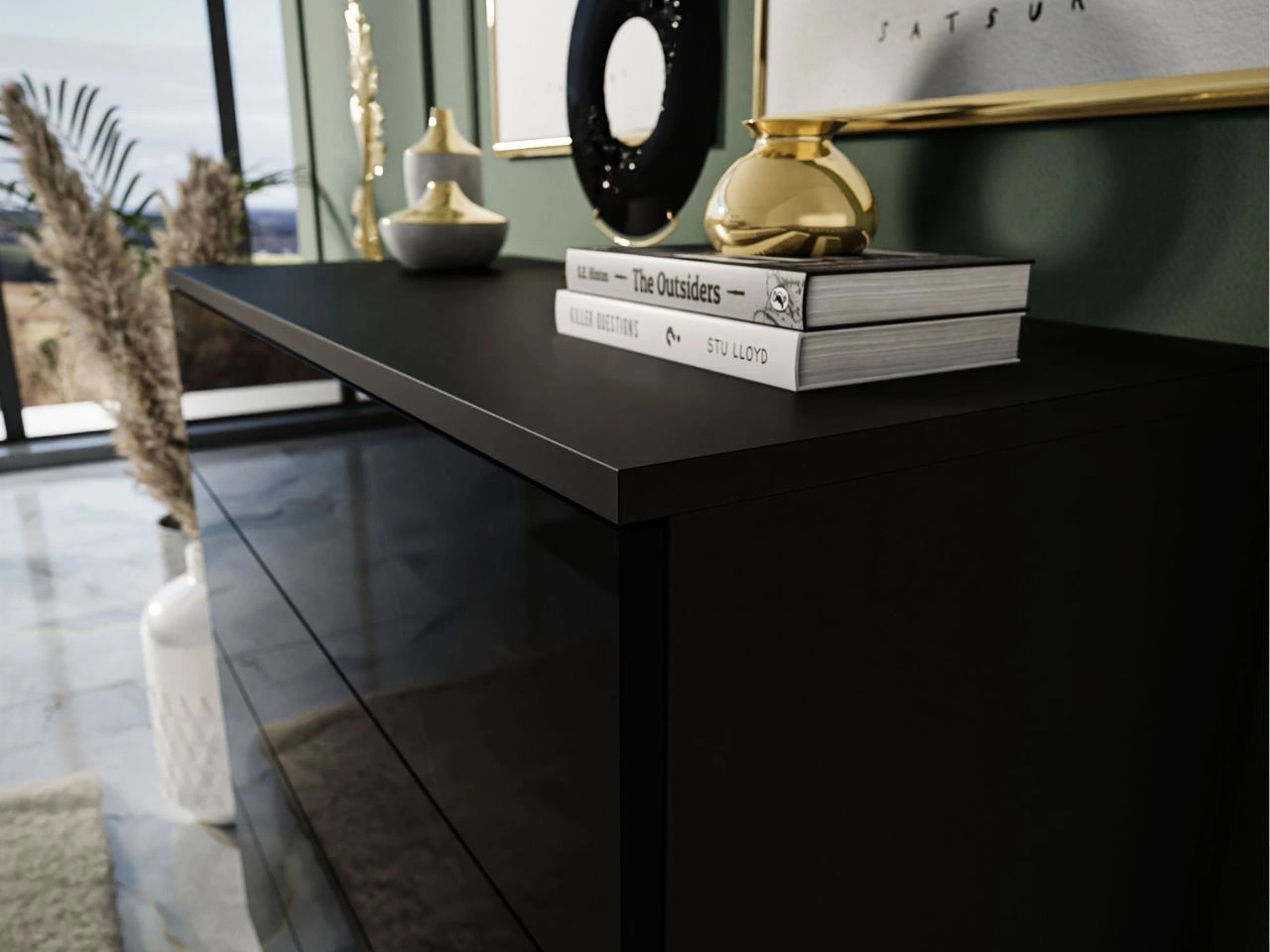 Suchen Sie ein praktisches und stilvolles Möbelstück für Ihr Zuhause? Schwarze Kommode Nuveo ist die ideale Lösung für Wohnzimmer, Schlafzimmer, Flur oder Jugendzimmer. Ihre moderne Form und der Hochglanz lassen den Raum optisch größer wirken und verleihen ihm Leichtigkeit und Eleganz.