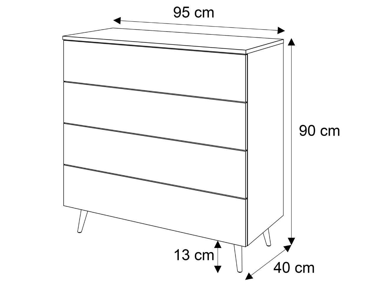 Kommode ist mit vier geräumigen Schubladen ausgestattet, die das Verstauen von Kleidung, Dokumenten, Accessoires oder kleinen Gegenständen erleichtern. Die breite Ablagefläche eignet sich perfekt für Dekorationen, Pflanzen oder Familienfotos.