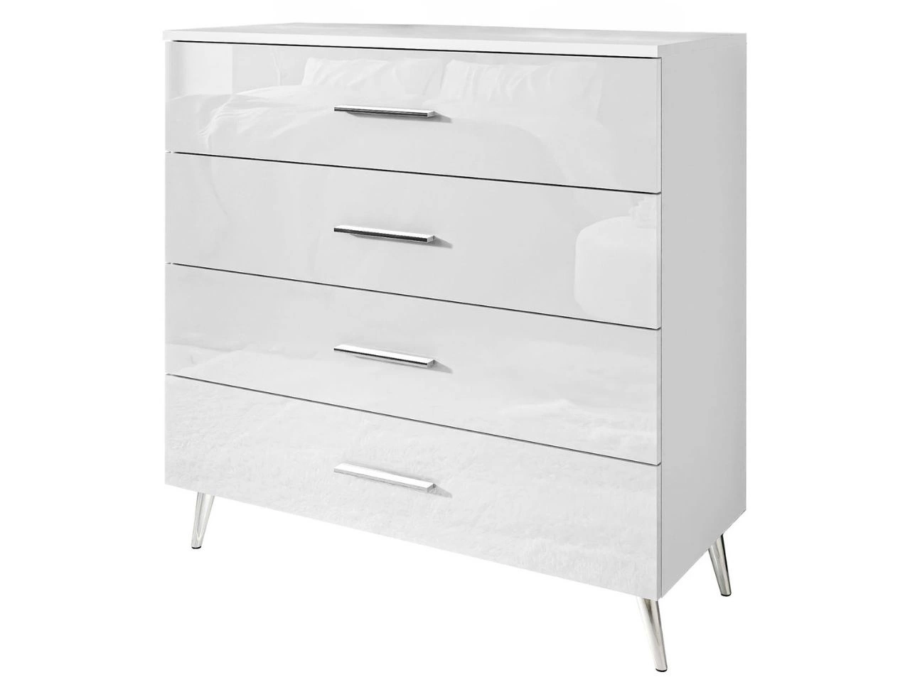 Du ziehst an: Kommode mit vier Schubladen und LED-Beleuchtung auf Silbernen Metallbeinen Nuveo Weiß Hochglanz