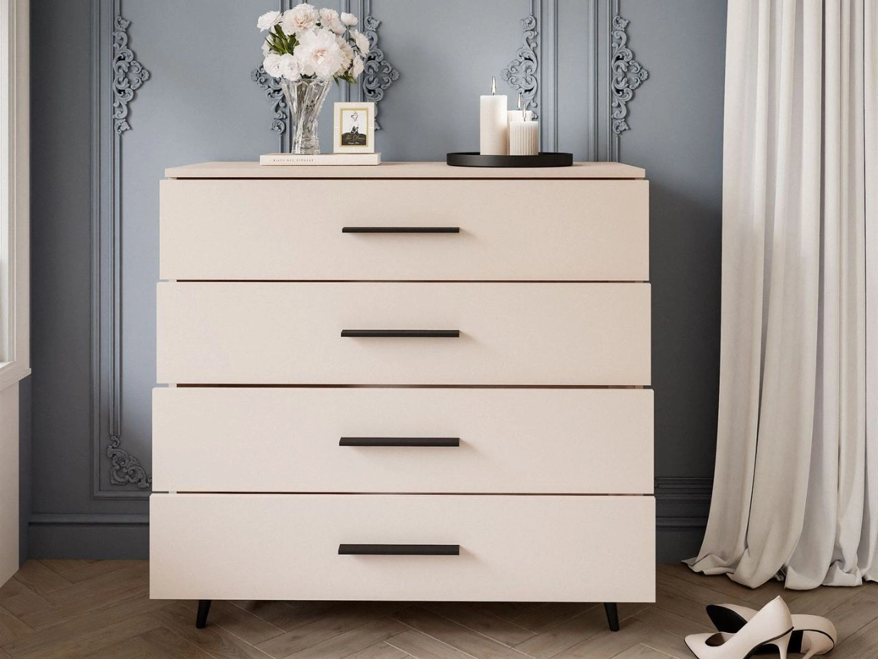 Kommode ist mit vier geräumigen Schubladen ausgestattet, die das Verstauen von Kleidung, Dokumenten, Accessoires oder kleinen Gegenständen erleichtern. Die breite Ablagefläche eignet sich perfekt für Dekorationen, Pflanzen oder Familienfotos.