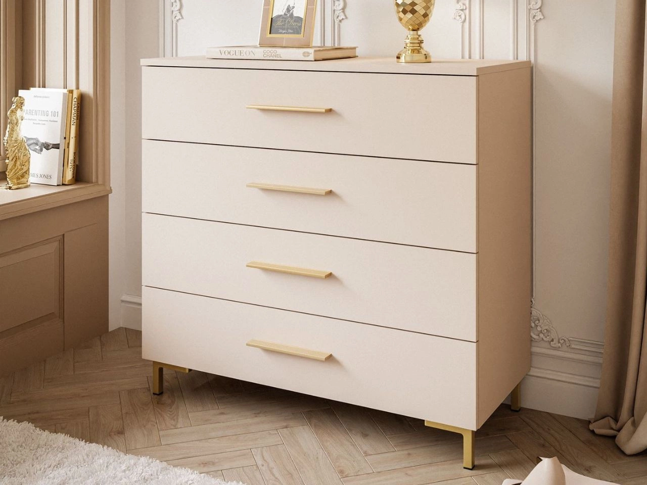 Kommode ist mit vier geräumigen Schubladen ausgestattet, die das Verstauen von Kleidung, Dokumenten, Accessoires oder kleinen Gegenständen erleichtern. Die breite Ablagefläche eignet sich perfekt für Dekorationen, Pflanzen oder Familienfotos.
