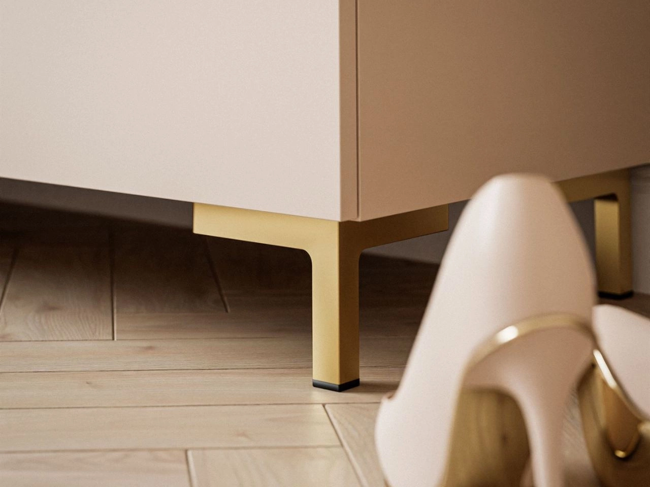 Möbelstück wurde aus hochwertiger laminierter Platte mit ABS-Kante gefertigt, wodurch es langlebig, widerstandsfähig im Gebrauch und pflegeleicht ist. Praktische goldene Griffe und Beine gewährleisten Komfort bei der Nutzung und Stabilität der Konstruktion.