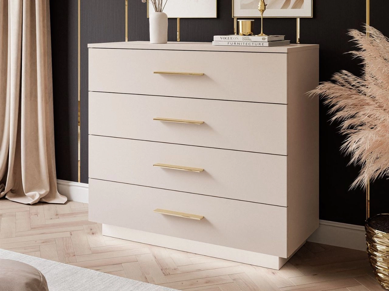 Kommode ist mit vier geräumigen Schubladen ausgestattet, die das Verstauen von Kleidung, Dokumenten, Accessoires oder kleinen Gegenständen erleichtern. Die breite Ablagefläche eignet sich perfekt für Dekorationen, Pflanzen oder Familienfotos.