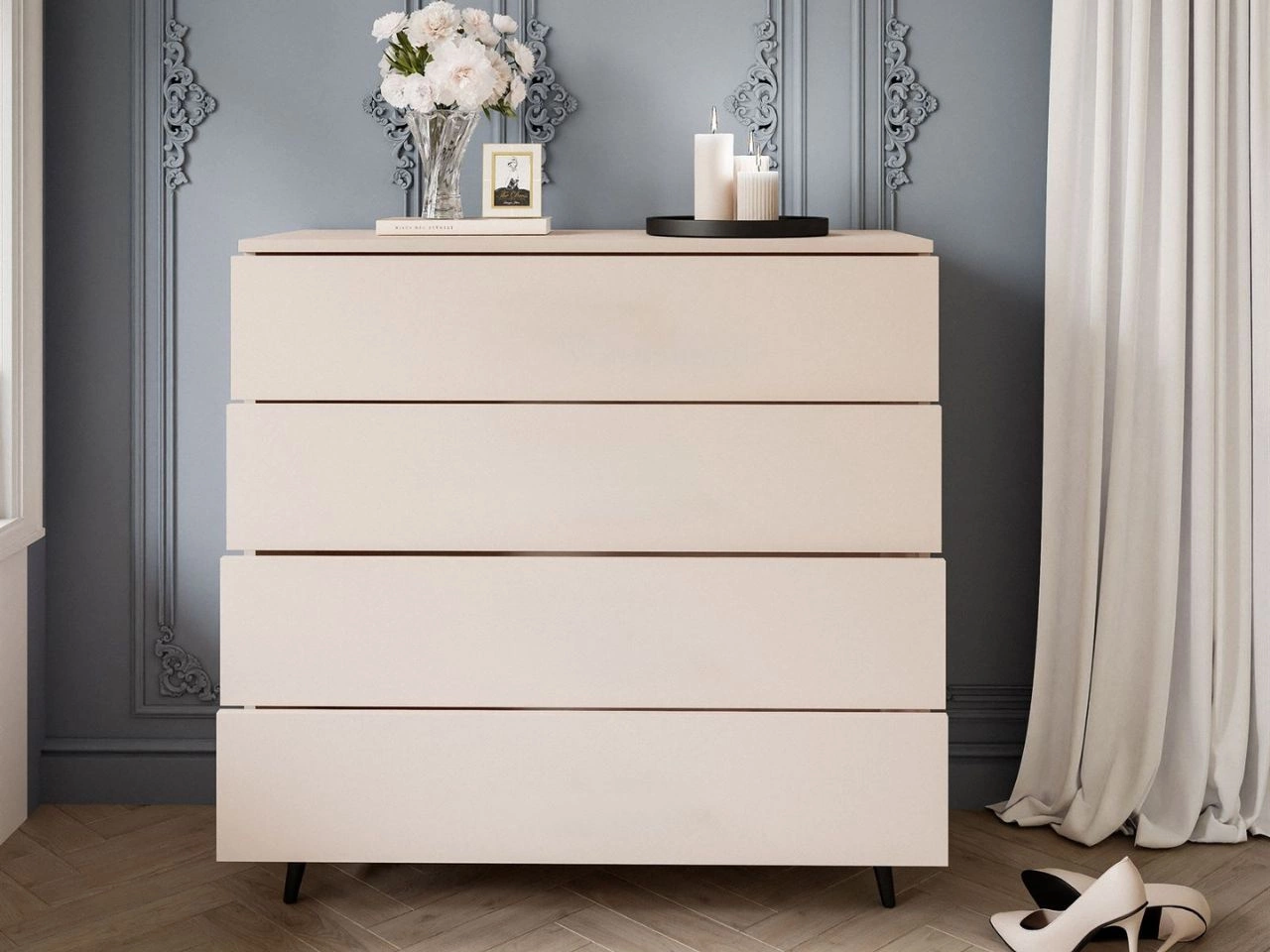 Kommode ist mit vier geräumigen Schubladen ausgestattet, die das Verstauen von Kleidung, Dokumenten, Accessoires oder kleinen Gegenständen erleichtern. Die breite Ablagefläche eignet sich perfekt für Dekorationen, Pflanzen oder Familienfotos.